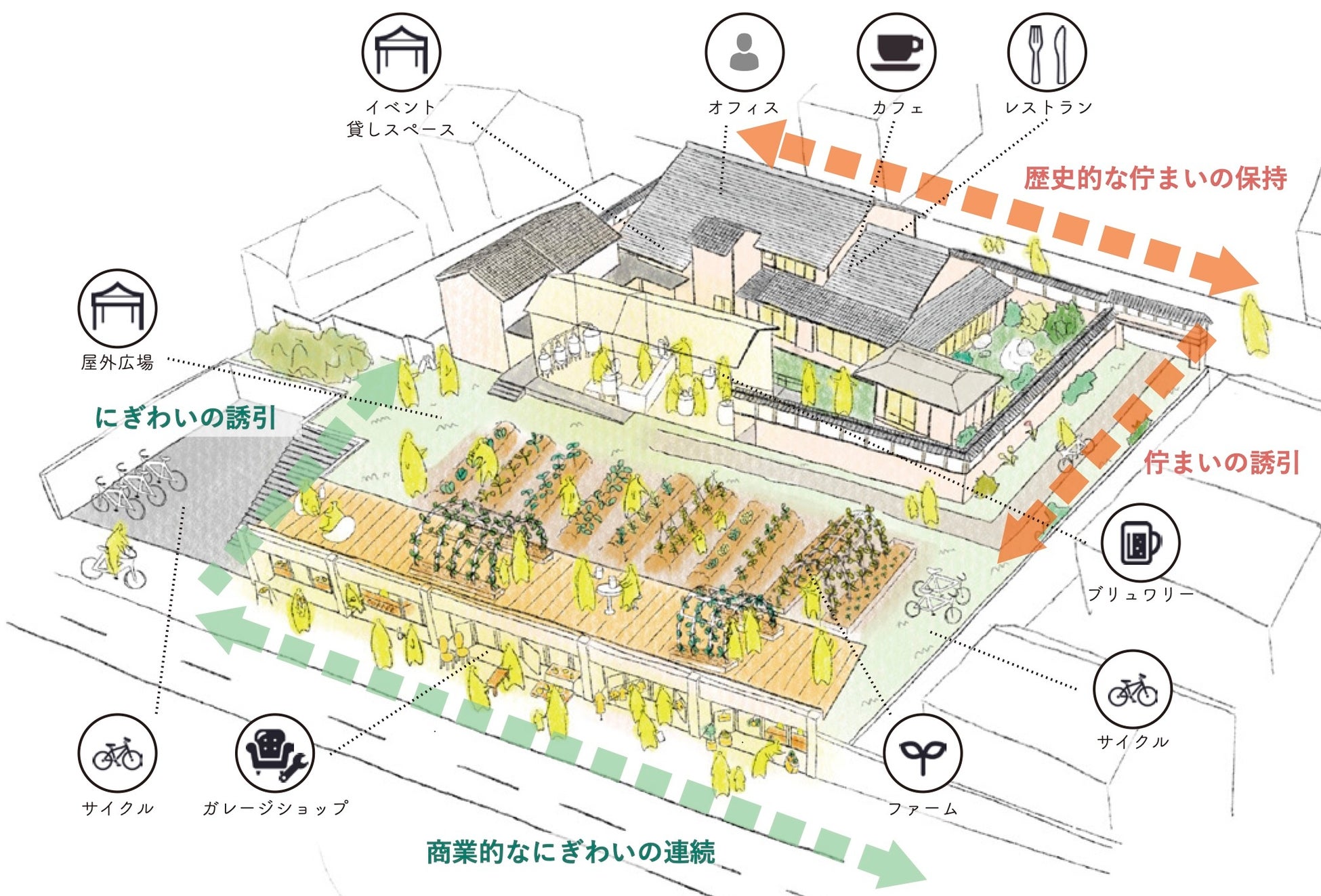 施設構成(予定):レストラン、カフェ、物販、ブリュワリー、農園などの複合型