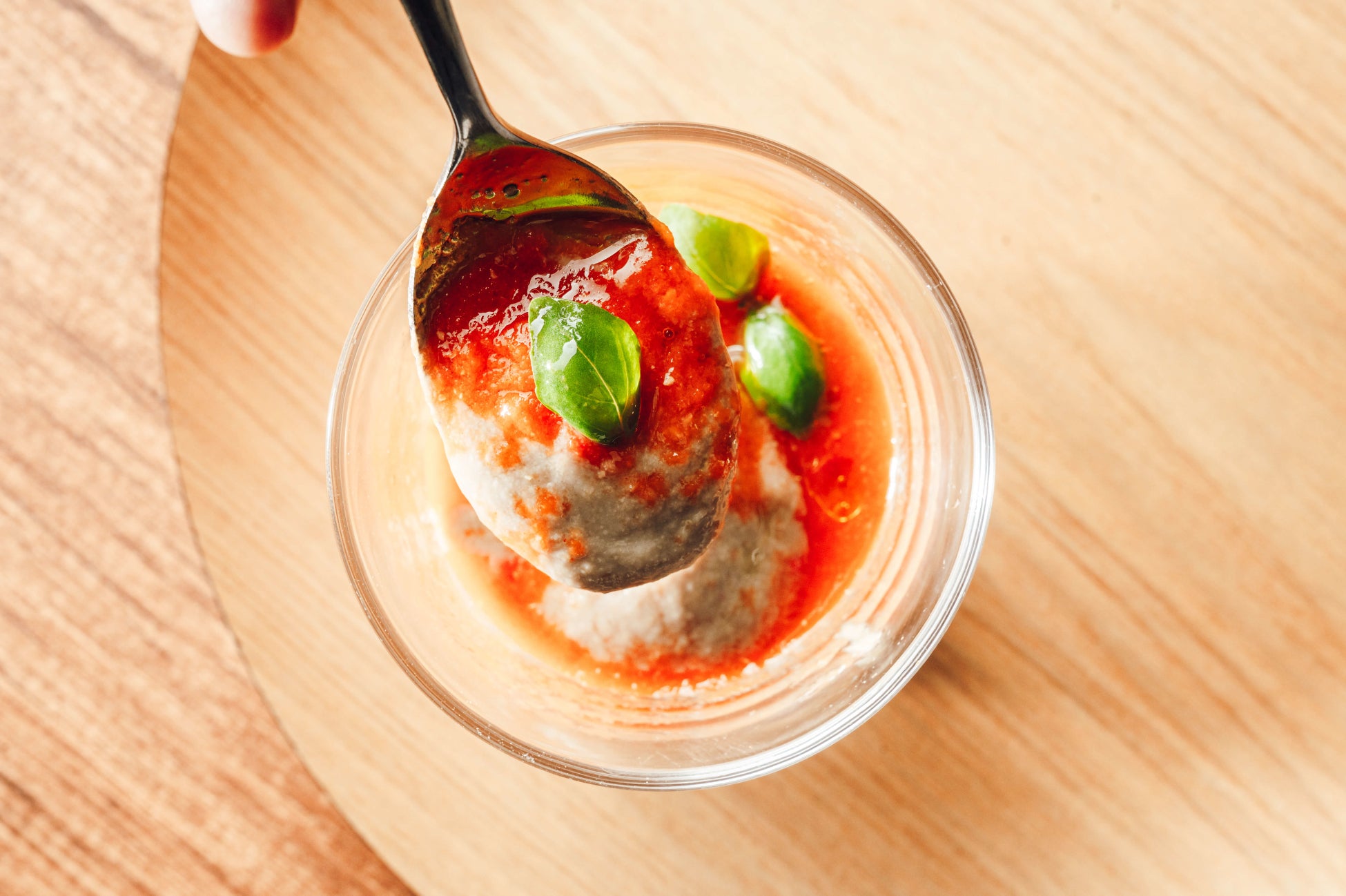 器に見立てたアンディーブごと指で摘んでお召し上がりください。アンディーブの心地よい苦味と瑞々しさも加わり、夏らしいさっぱりとした1品です。豆乳クリームがピクルスの酸味を穏やかにまとめています。