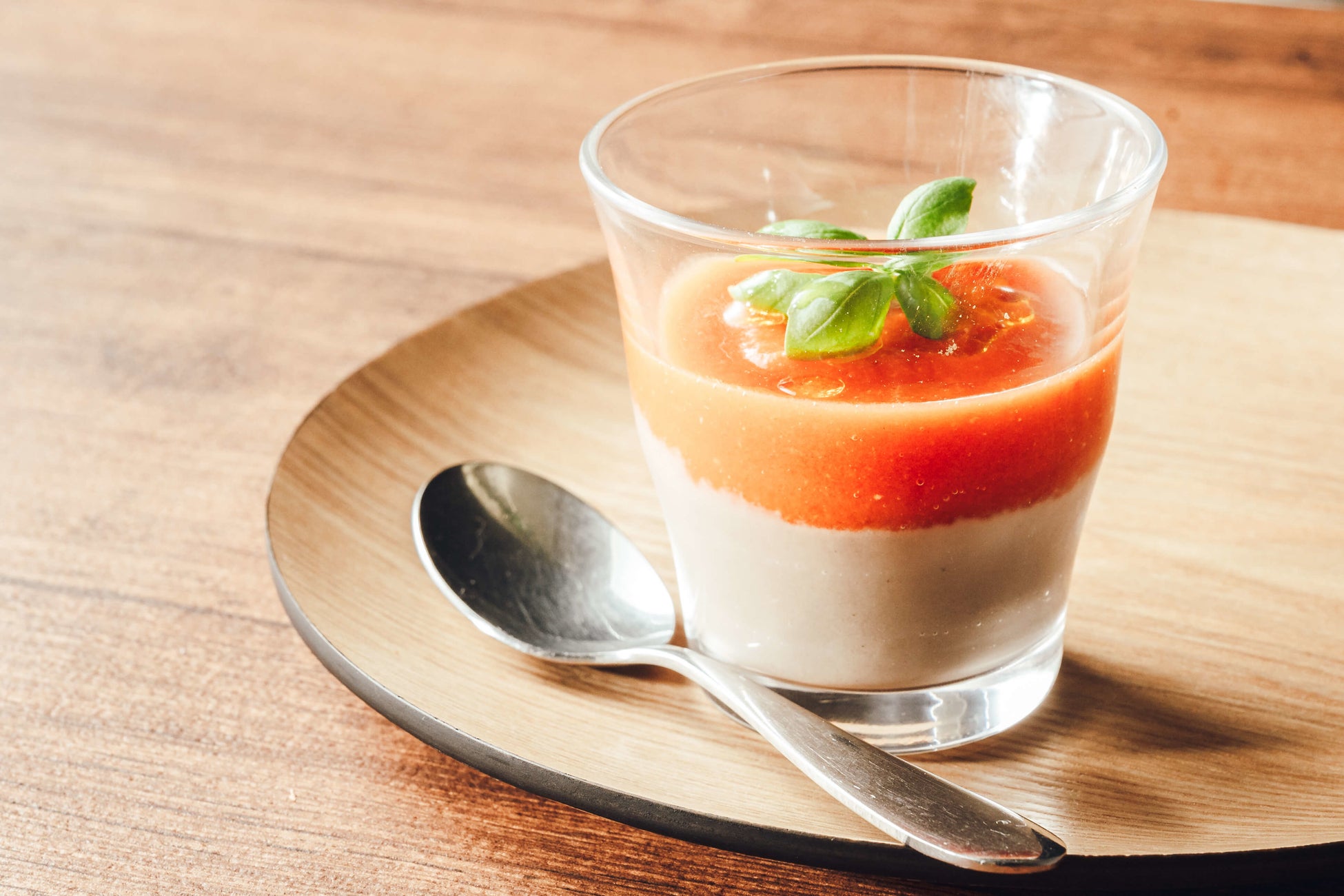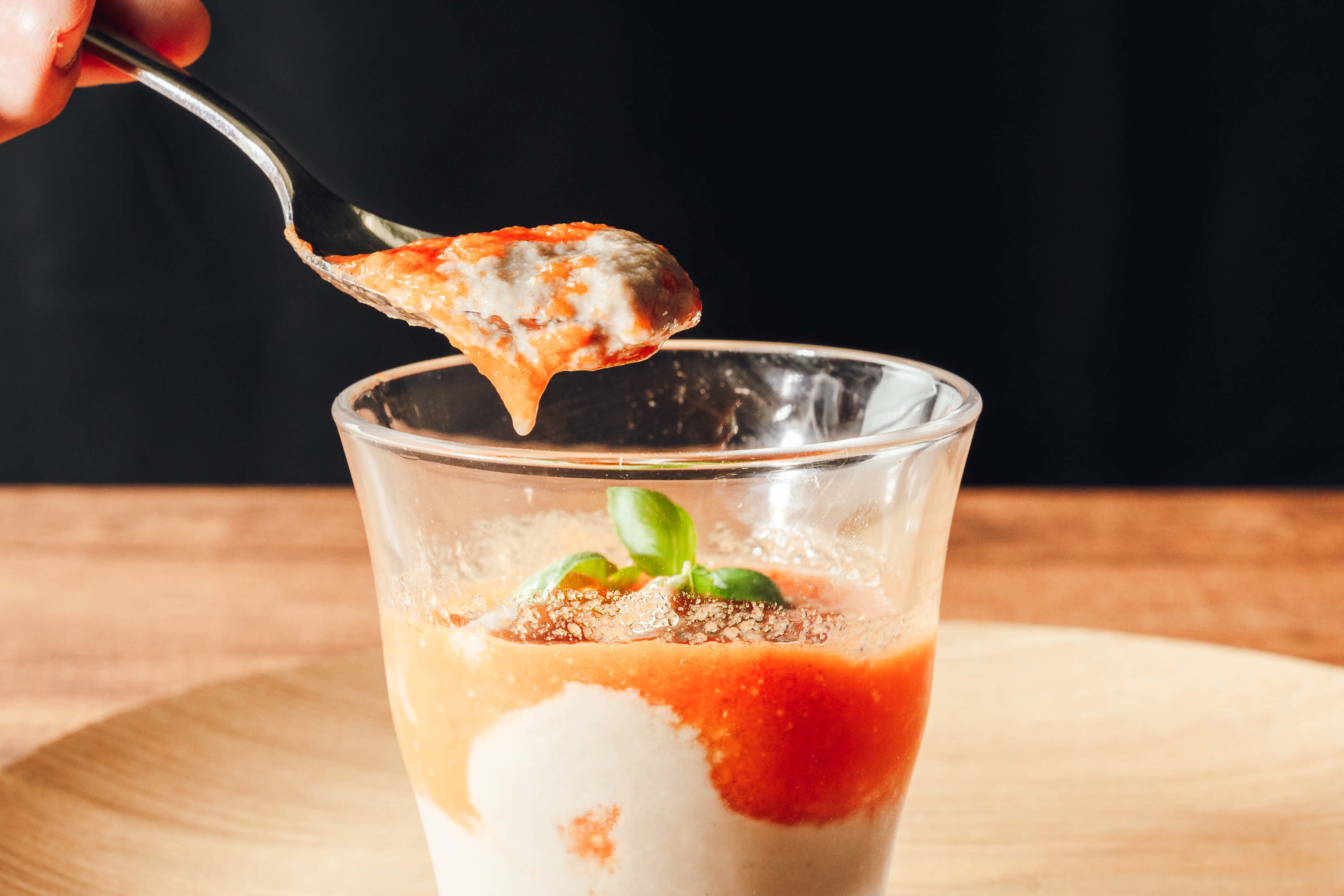濃厚なマッシュルームの冷製とクミンの効いたトマトのガスパチョをよく混ぜていただきます。