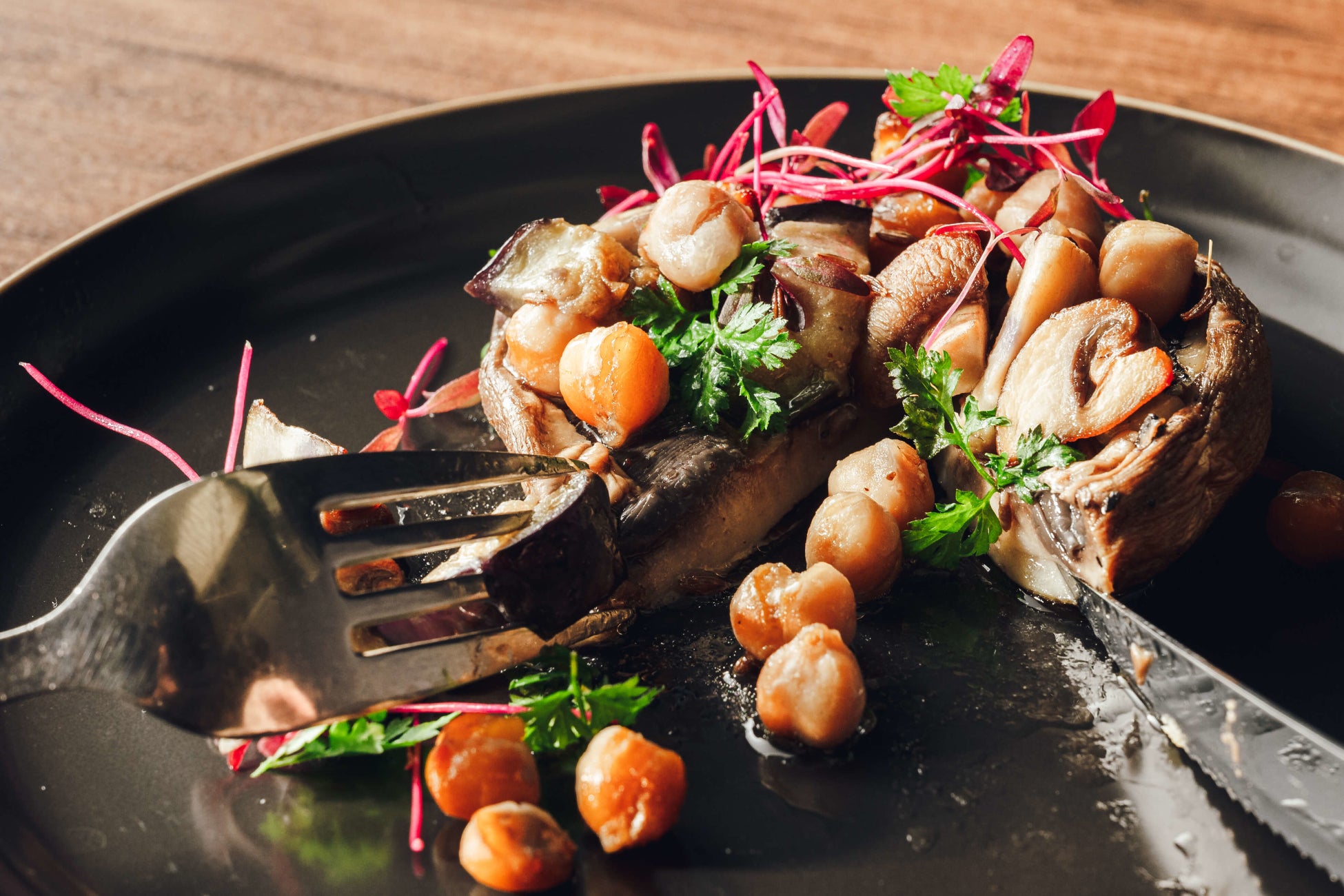 ◆ジャンボマッシュルームのプランチャ~ひよこ豆とナスのクミン風味~