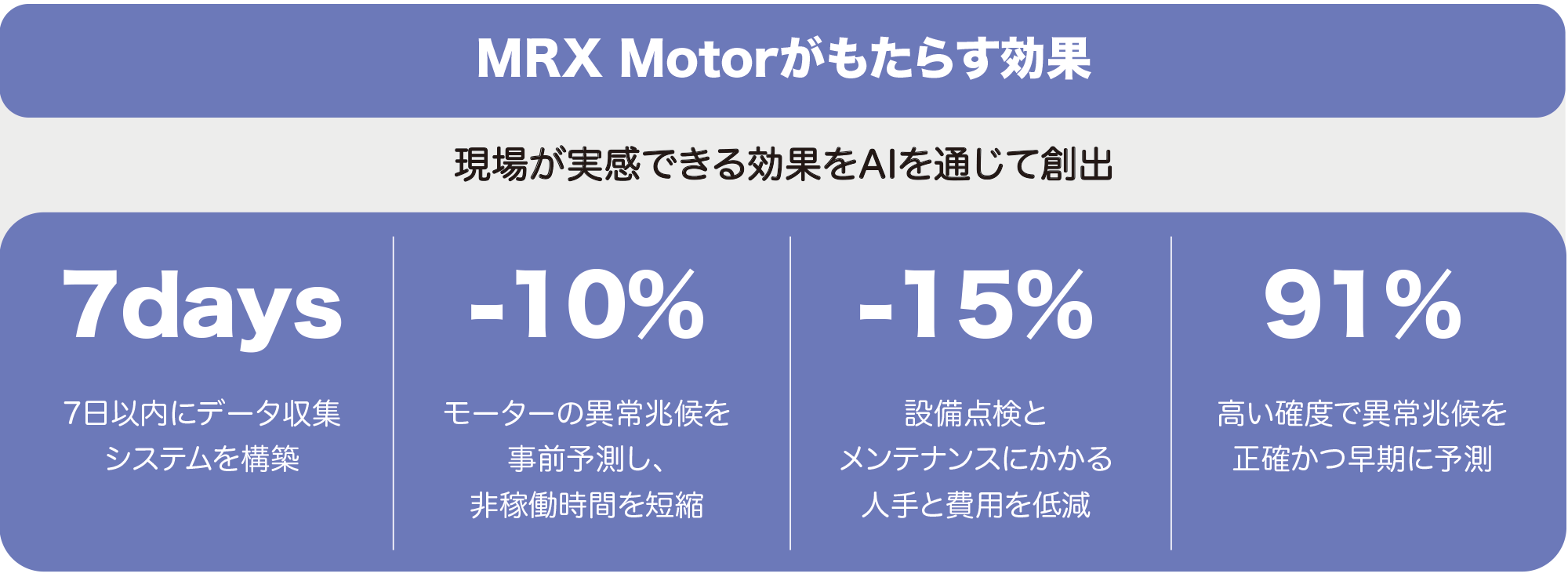 モーターは多くの生産ラインで使用される重要な設備であり、これらの予期せぬ故障は生産ラインの停止につながり、生産性を大きく左右します。MRX Motorは複雑な工事なしにモーターのデータを安定して収集できる無線振動センサー設置からデータ前処理およびデータパイプライン構築、AIでリアルタイムなインサイトを視覚化するダッシュボードまでを提供する産業用モーターのためのAIソリューションです。