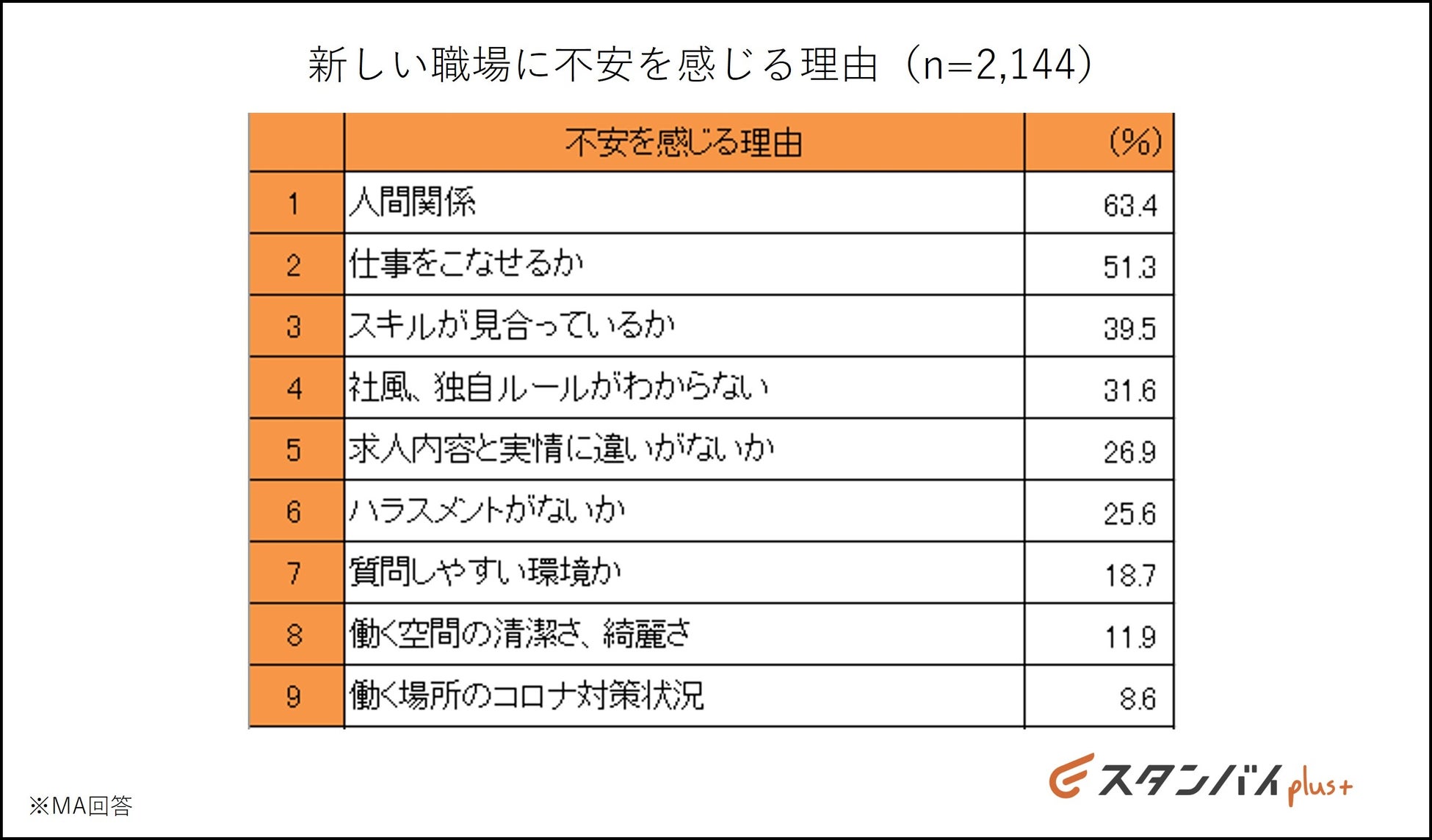 不安に感じる(とても不安に感じる、不安に感じる、多少不安に感じる)と回答された方に聞いた不安理由として1番多かったのは「人間関係」、続いて「仕事をこなせるか」「スキルが見合っているか」という回答でした。