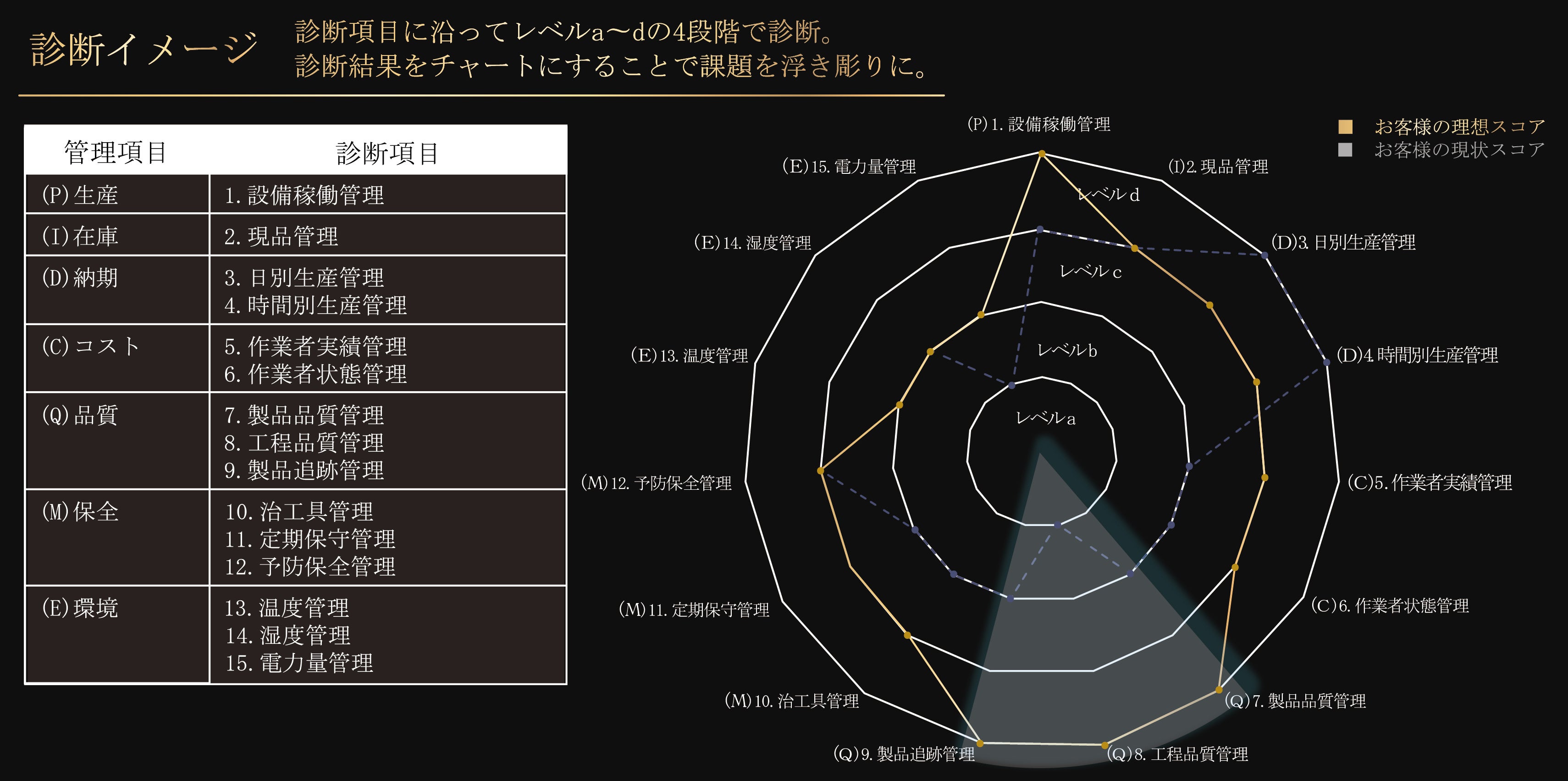 1:工場における主要7項目に沿った15の診断項目で現状をスコア化し課題を浮き彫りにします