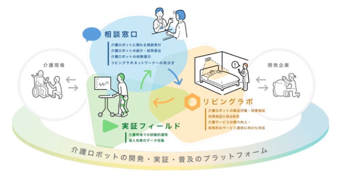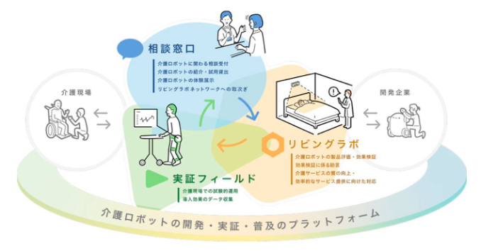 本事業は、地域における相談窓口の設置、介護ロボットの評価・効果検証を実施するリビングラボ(開発の促進機関)を含む関係機関のネットワークの形成、実証フィールドの整備などを行うことで、全国版プラットフォームを構築し、介護ロボットの開発・実証・普及の流れを加速化することを目指しています。
