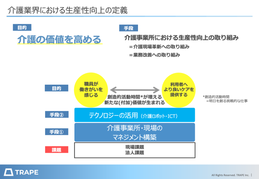株式会社TRAPEは、2017年の介護業界において生産性向上という言葉が用いられた黎明期から、以下の活動を行ってきました。