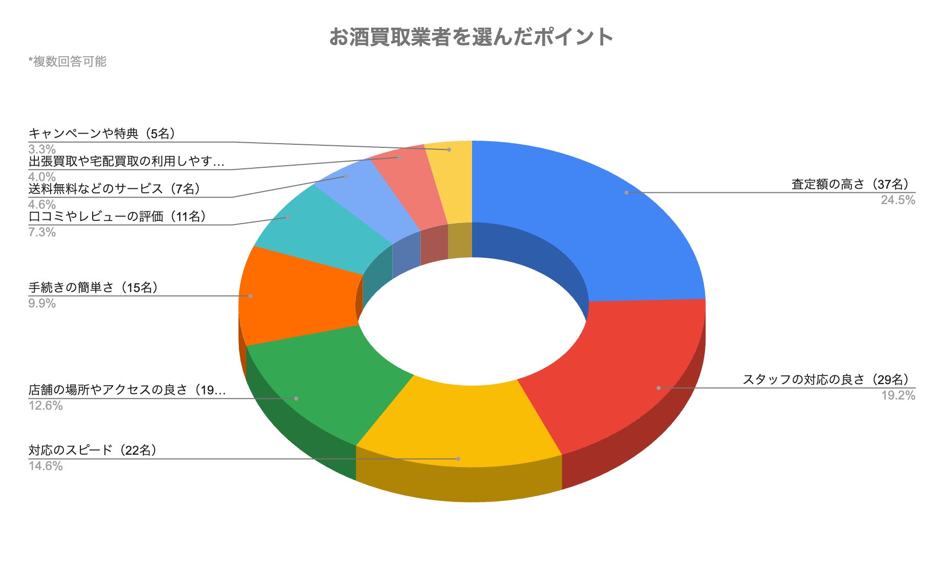 お酒買取業者を選んだポイントを複数の選択肢から伺ったところ、「査定価格の高さ」が37名と最も多くなりました。