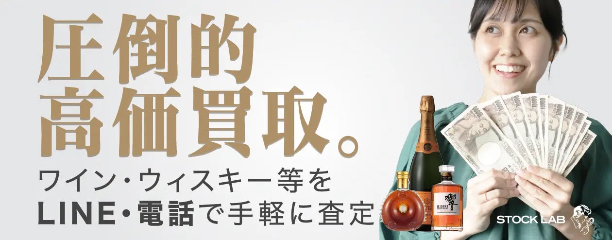 ストックラボでは”圧倒的高価買取。”をモットーに、お酒の買取を実施しています。幅広い商品を取り扱っており、独自の販売ルートを強みに他社には負けない査定価格をご提示いたします。