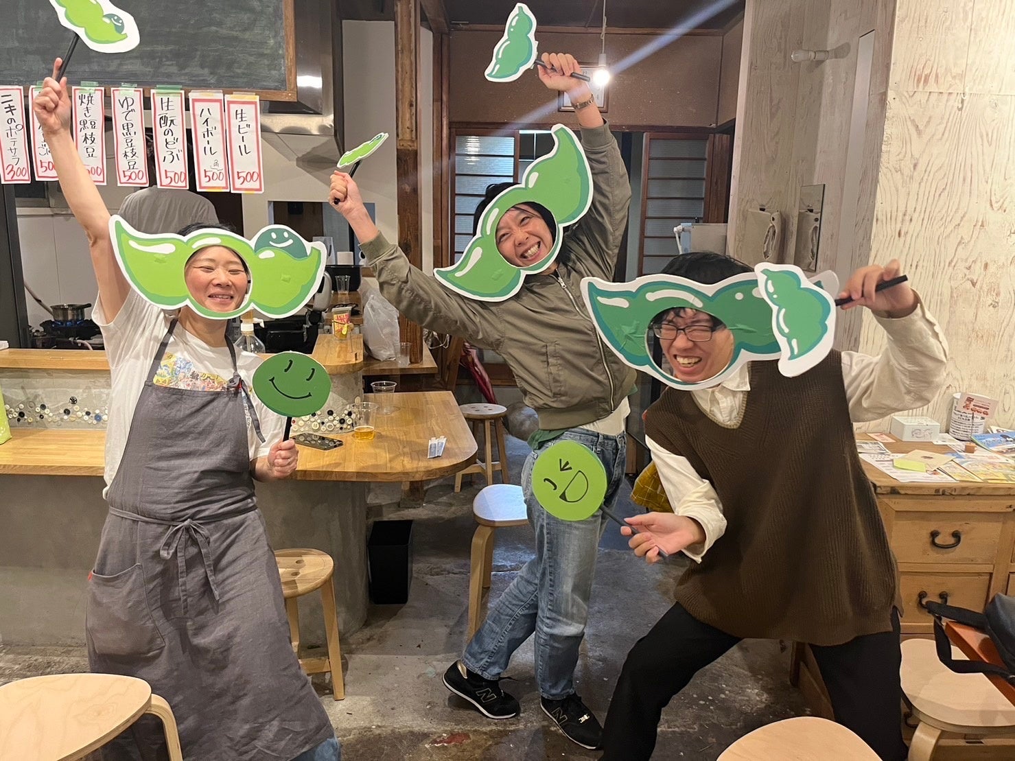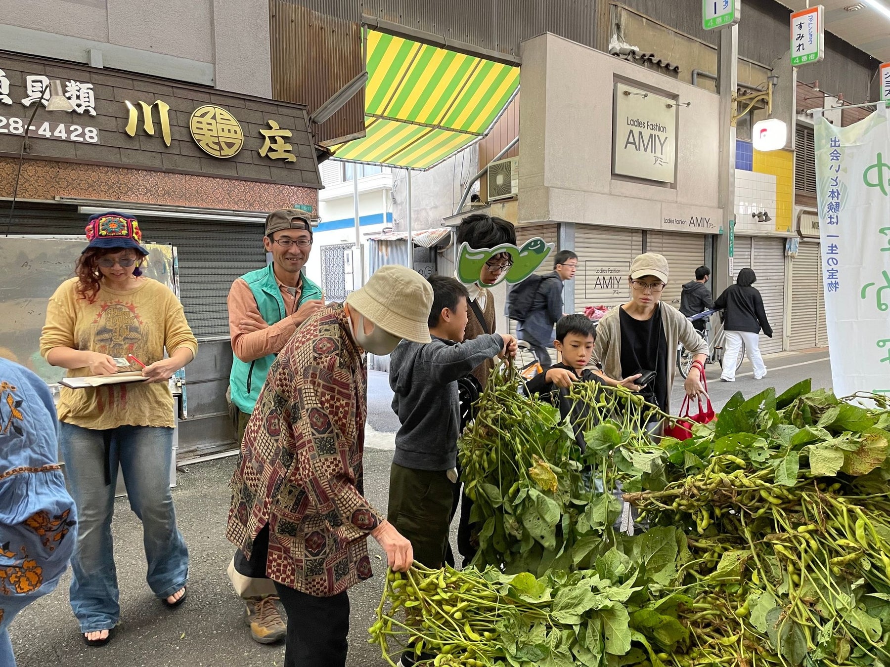「ふるシェア」連携地域の奈良県宇陀市にて栽培した黒豆の枝豆を早朝から収穫し、文の里商店街へ運び「朝どれ産直販売イベント」を行いました。宇陀で関係人口づくりに取り組む「ゆたかな宇陀」のメンバーも商店街に来て店頭に立つことで、黒枝豆の魅力や宇陀の魅力などを大阪の消費者に直接伝え、販売予定の100株の黒枝豆は即完売しました。また夜には黒枝豆を食べながら宇陀の皆さんと交流する宴会を設け、関係人口の拡大を図りました。