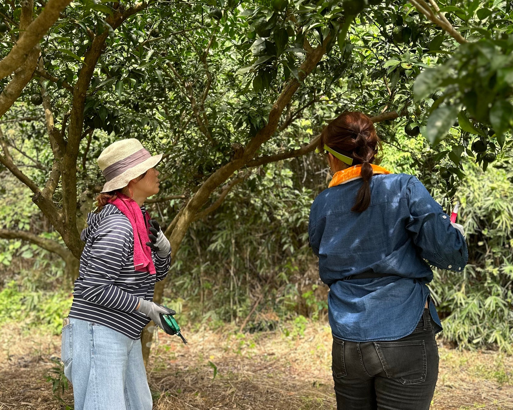 【写真上】農家さんの指導の下、柚子の間引きの手伝いを行う様子
