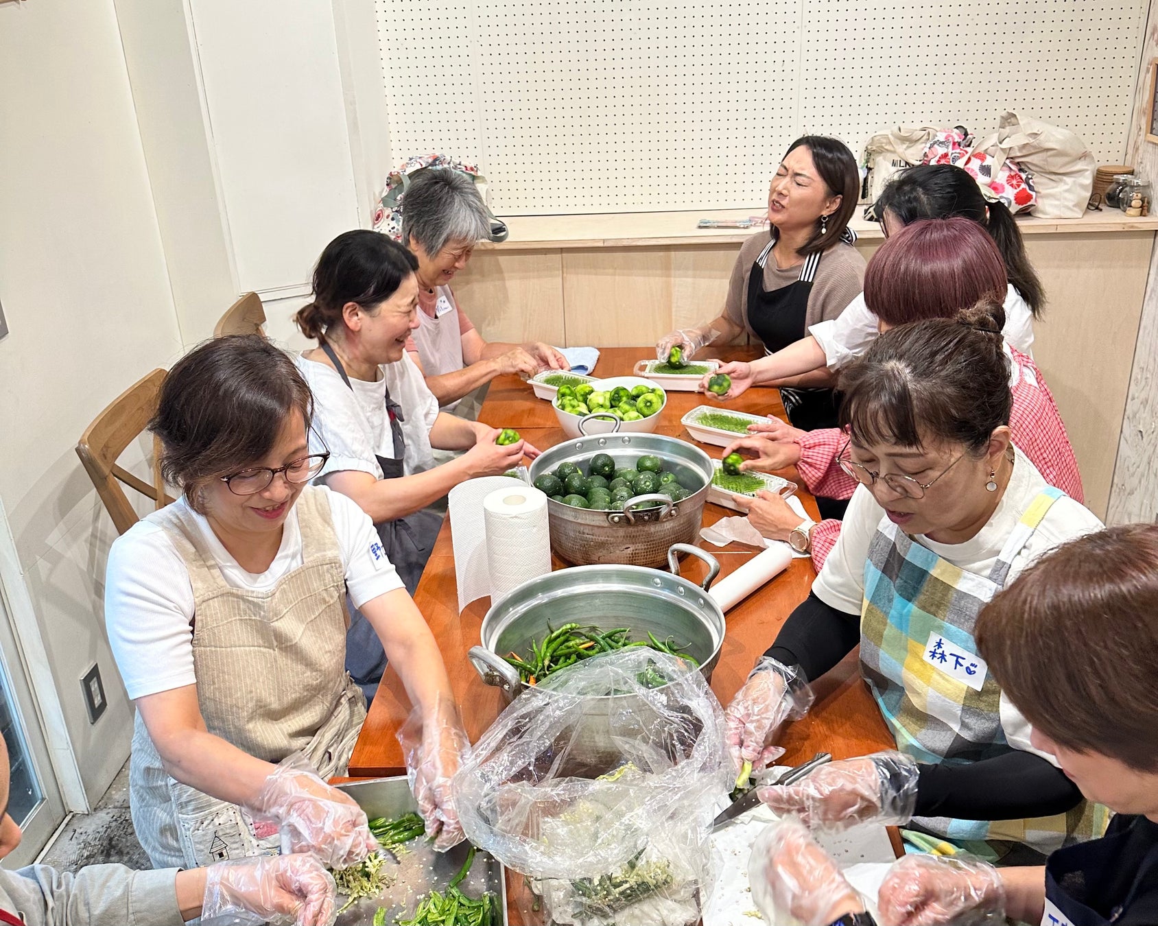 「ふるシェア」連携地域の岡山県久米南町の高齢農家の柚子畑へ大阪から間引きの手伝いに行ってきました。間引いた青柚子を文の里商店街シェアキッチンbotanに持ち帰り、20名以上の参加者と共に柚子胡椒づくりを行いました。出来上がった柚子胡椒はラベルをつけてボトリングし農家さんへプレゼントし、関係人口として交流を深めました。