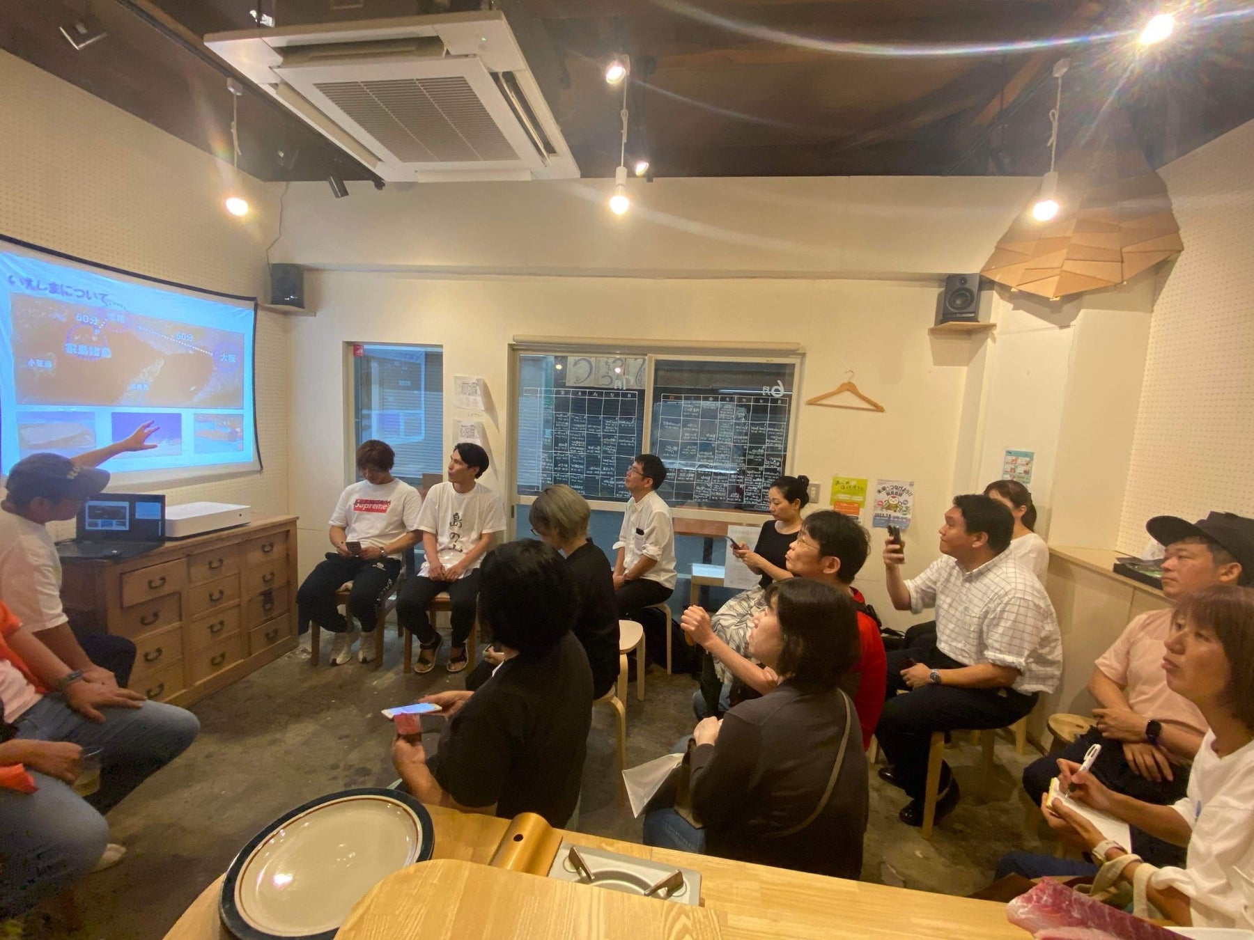 「ふるシェア」連携地域の兵庫県姫路市家島から、家島に移住して観光まちづくりを担う「いえしまコンシェルジュ」の中西氏や、インスタフォロー2万人の漁師「ともん」こと中村氏が来て、家島の魅力や漁業などについて語っていただきました。その後は20名以上の参加者の皆さんと「ともん」が獲ってきた魚を中心に食事を楽しむ交流イベントを行いました。