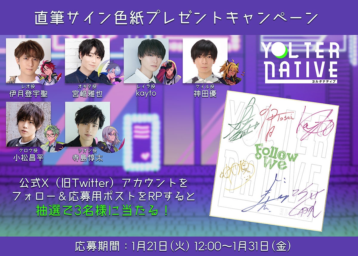 プロジェクト起動を記念し、伊月登宇聖さん、宮﨑雅也さん、kaytoさん、神田優さん、小松昌平さん、寺島惇太さん、6名の豪華キャストサイン入り色紙が、抽選で3名様に当たるチャンス!公式X(旧Twitter)アカウントをフォロー&対象ツイートをリポストして応募完了。