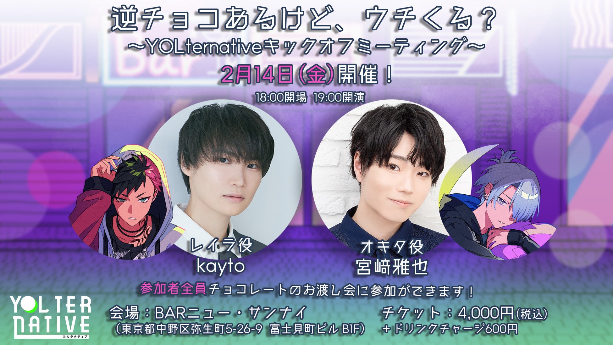 オキタ役・宮﨑雅也さんと硝子レイラ役・kaytoさんが登場する逆チョコお渡し会と、キャストトーク・『YOLternative』コンテンツの上映を行います。イベント会場限定のオリジナルグッズ販売&豪華サイン入りグッズプレゼント企画も実施予定です!