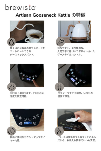もちろん、brewista Artisan Gooseneck Kettleの優れたポイントや機能はそのまま。安心して使っていただけます。