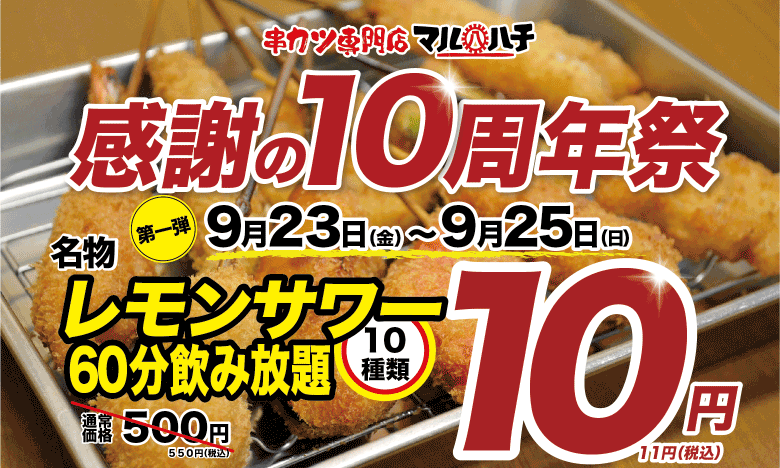 60分飲み放題【レモンサワー10円】など大型イベント!マルハチ感謝の10周年祭を開催します