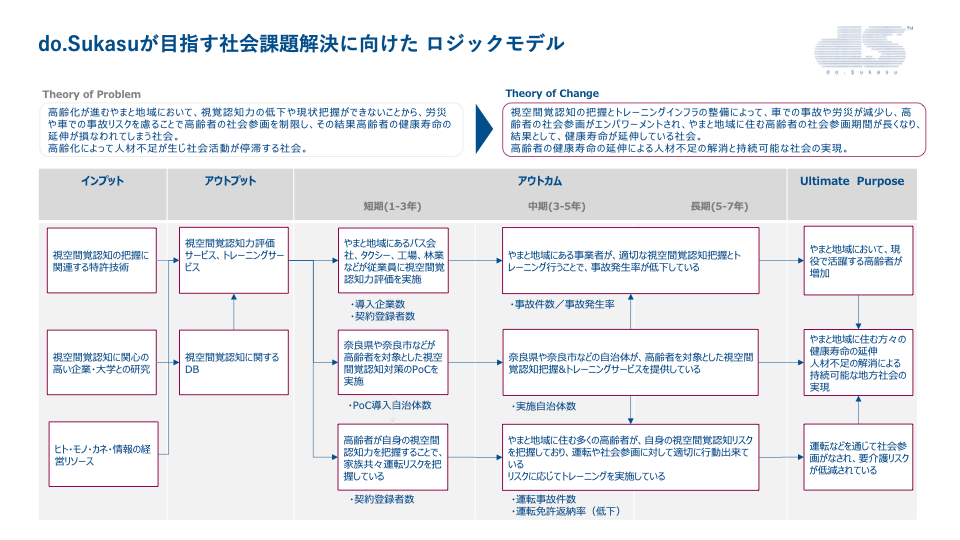 そこで、do.Sukasuは視覚認知能力の適切なアセスメントとトレーニングを提供するため、VR技術を活用したプロダクト「de.Sukasu(デスカス)」(注1)の独自開発を行っています。これによって、自動車の運転や工場をはじめとしたさまざまな場面での安全性を高め、社会課題解決に至る道筋を体系的に図示化したロジックモデル(図1)のとおり、取り組みを進めてまいります。