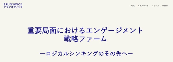 ブランズウィック・グループは、重要局面におけるステークホルダーへのエンゲージメント戦略について立案から実行までを支援する戦略コンサルティング・ファームです。CEO交代、戦略の抜本的な更新、M&A、物言う株主(アクティビスト)対応、事業再編、訴訟、サイバー攻撃等の危機対応といった重要局面では、鍵となるステークホルダーと効果的に関与(エンゲージメント)できるかが成否を分けます。当社はクライアント企業が世界でそのミッションを果たすべく支援することをパーパスとし、ビジネスと金融・政治・社会の領域が絡み合う複雑な重要課題に対処する経営陣を支援しています。「グローバル・ワン・ファーム」として、クライアント企業のニーズに対して、世界27都市の拠点が迅速かつシームレスに連携し、市場をまたいで多言語で的確に対応します。
