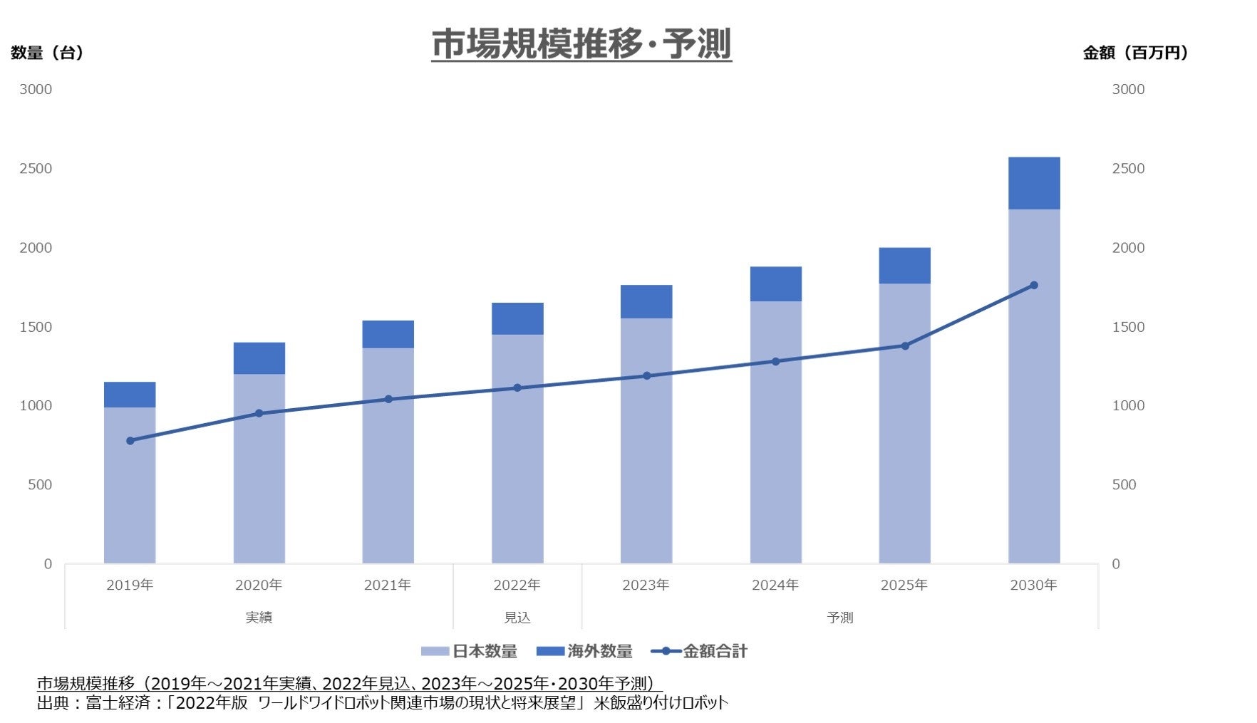 ご飯盛付けロボット市場は、衛生面や盛り付けのムラの改善、人手不足対応手段として外食、小売店、ホテルなどのバックヤードを中心に導入されてきました。日本国内では、各業種ともにオペレーションの効率化を図りたい大手チェーン中心の採用から、緊急事態宣言後の2020年以降は、個人事業主の外食店舗へとすそ野が広がり、市場が底上げされました。外食・小売・宿泊業の人手不足は深刻化しており、省人化や業務効率化の手段が求められており、さらなる成長が期待されている市場となっております。海外でも、ご飯食の需要が高まっており、大手外食チェーンの海外出店が回復すれば、日本食レストラン等での需要が見込めるため、海外市場でも右肩上がりでの市場推移が見込まれています。