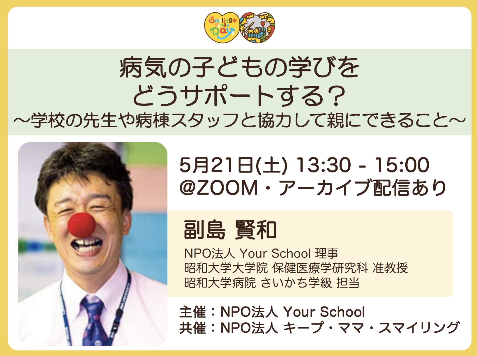- 登壇者 :副島賢和さん(昭和大学病院さいかち学級担当、同大学准教授、NPO法人Your School理事)