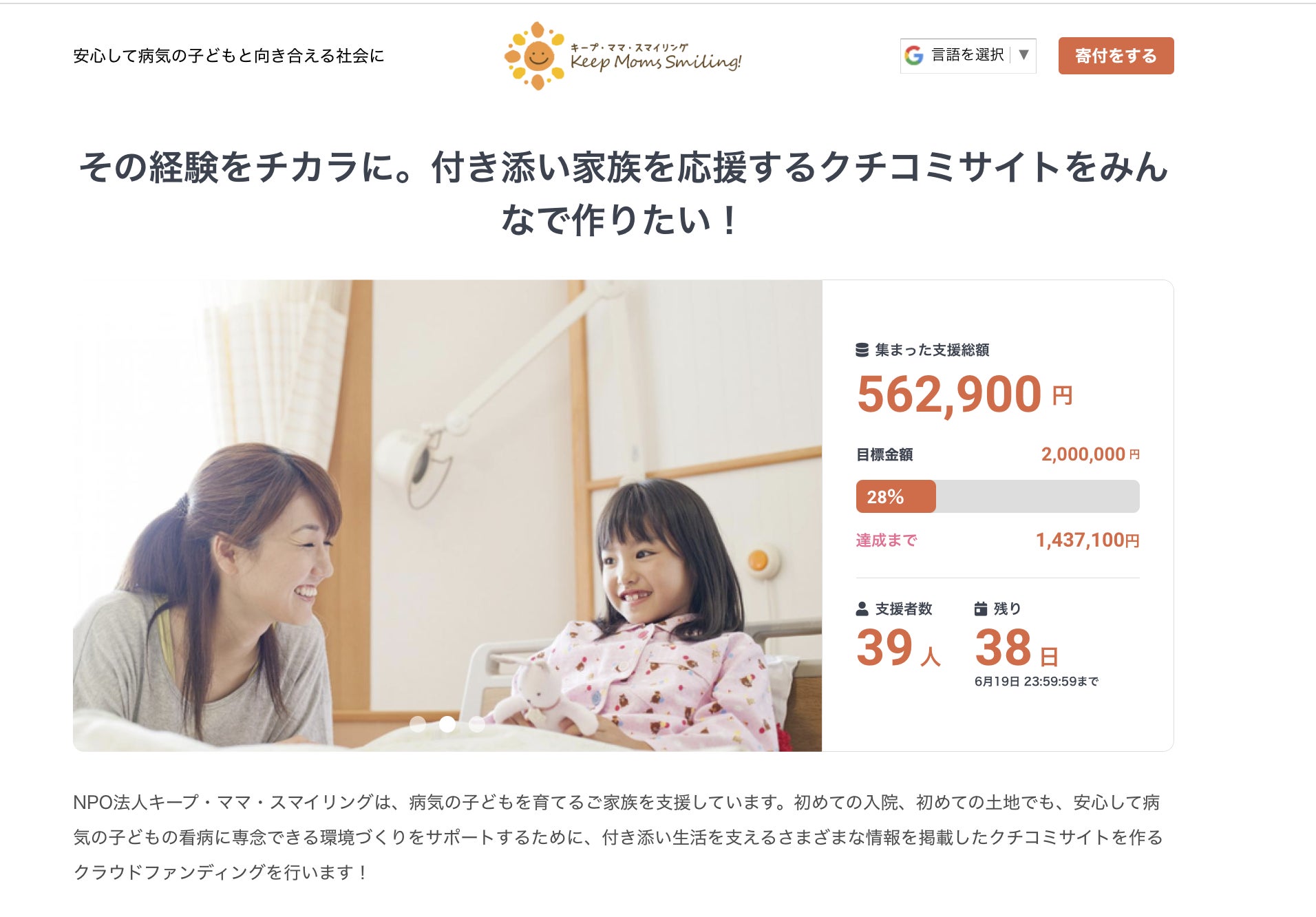 付き添いを経験したご家族から次のご家族へとバトンをつなぐクチコミサイトのクラウドファンディングの告知にご協力いただけますと幸いです。