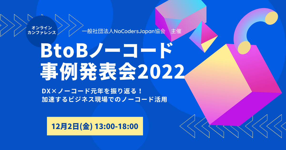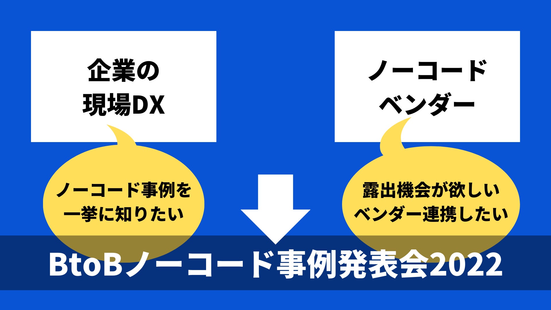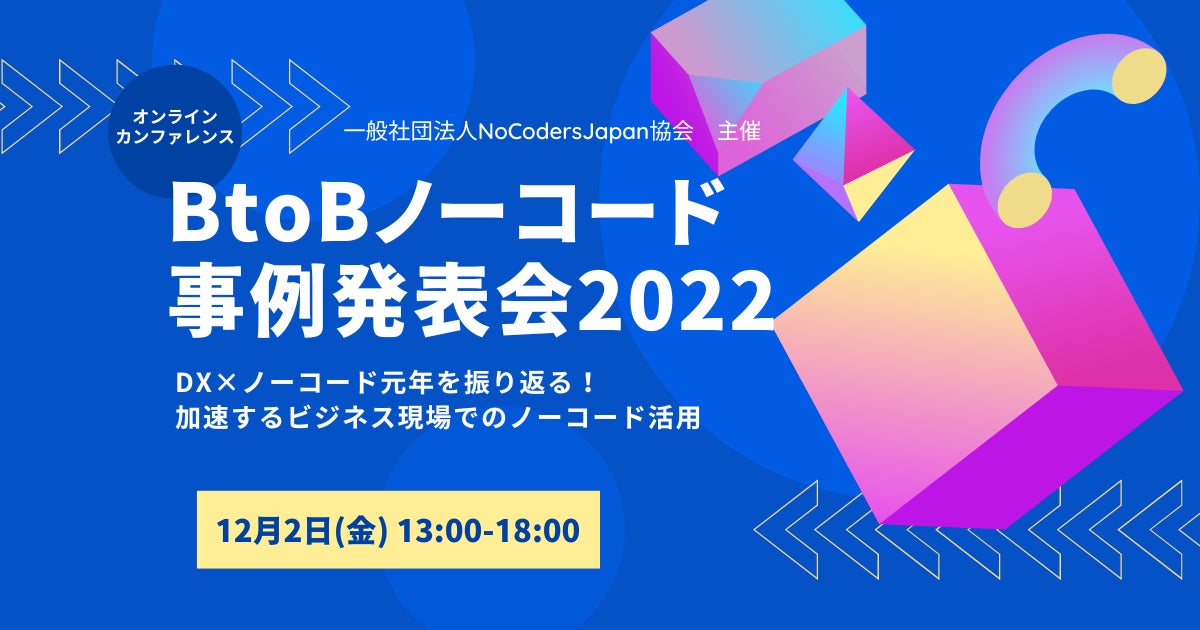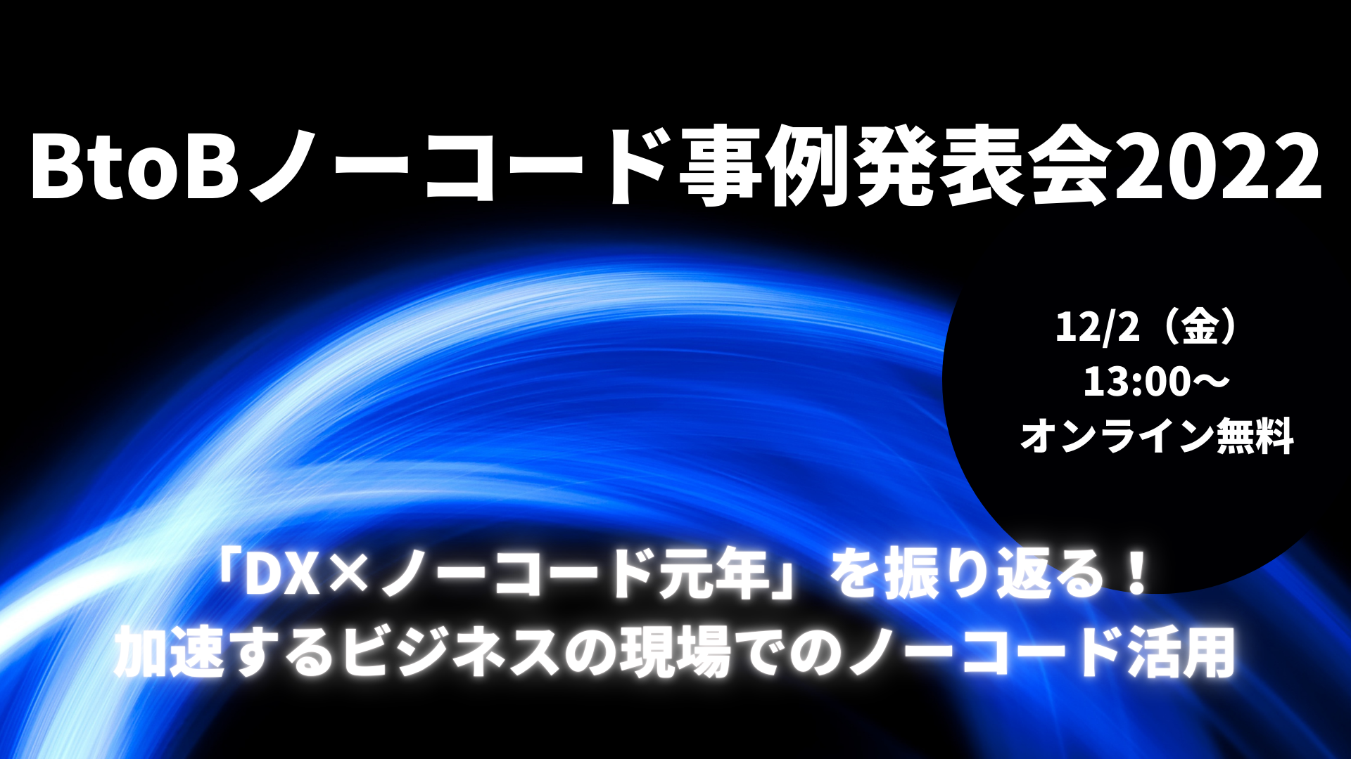 そこで、「ノーコード × DX」元年とも言える2022年の総括も兼ねて、「ノーコード × DX」の事例を集結させる試みとして、『BtoBノーコード事例発表会2022 〜「DX×ノーコード元年」を振り返る!加速するビジネスの現場でのノーコード活用〜』の開催を決定いたしました。【2022年12月2日(金)13時〜】