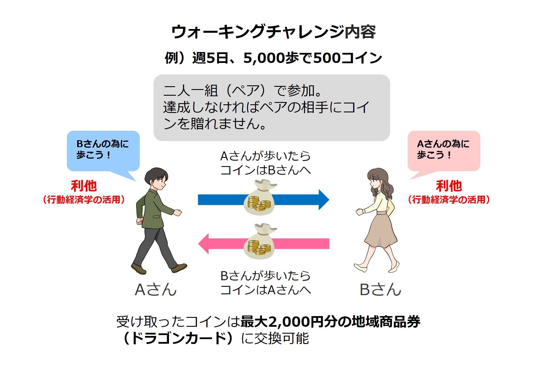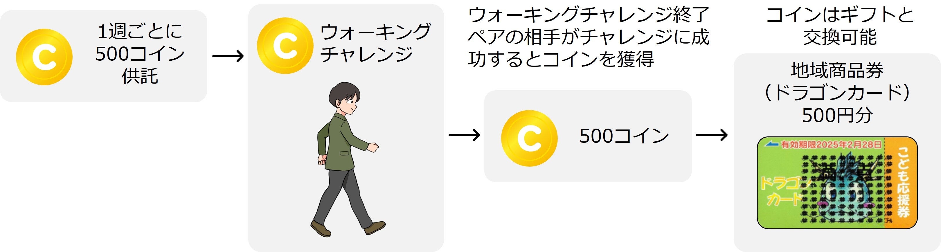 本事業では、自分が歩かないとペアの相手がコインを獲得できないインセンティブ設計のチャレンジを通じて参加者のウォーキングを促進します。チャレンジの成果に応じてコインが分配され、1週間の目標歩数を達成すると、ペアの相手に500円分の地域商品券(ドラゴンカード)と交換可能なコインが付与される設計です。