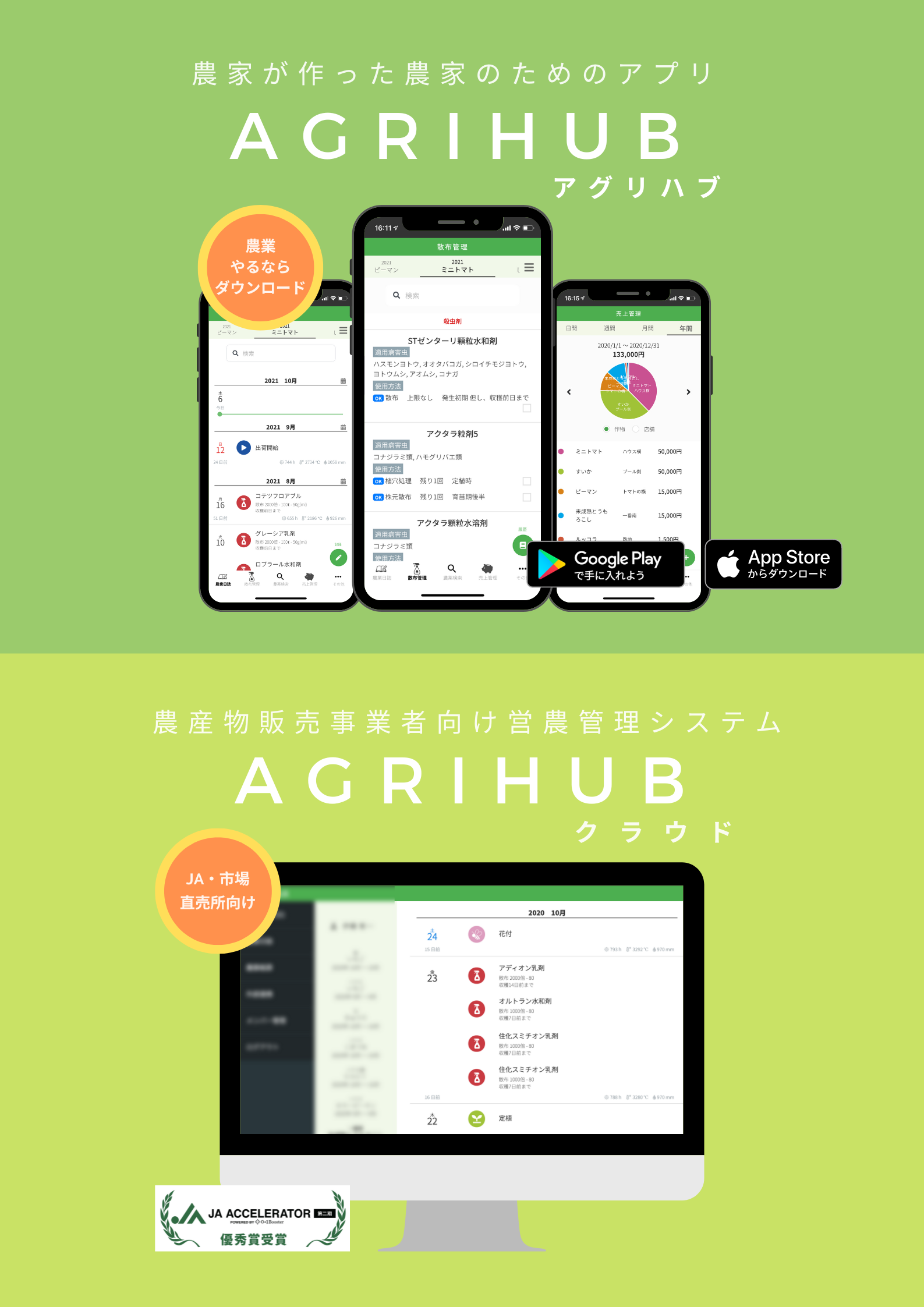 農家向けアプリ「AGRIHUB(アグリハブ)」農産物取扱事業者向けsaas 「AGRIHUBクラウド」の開発・運営を行う。株式会社Agrihubは、JAアクセラレーター第二期において優秀賞を受賞しました。