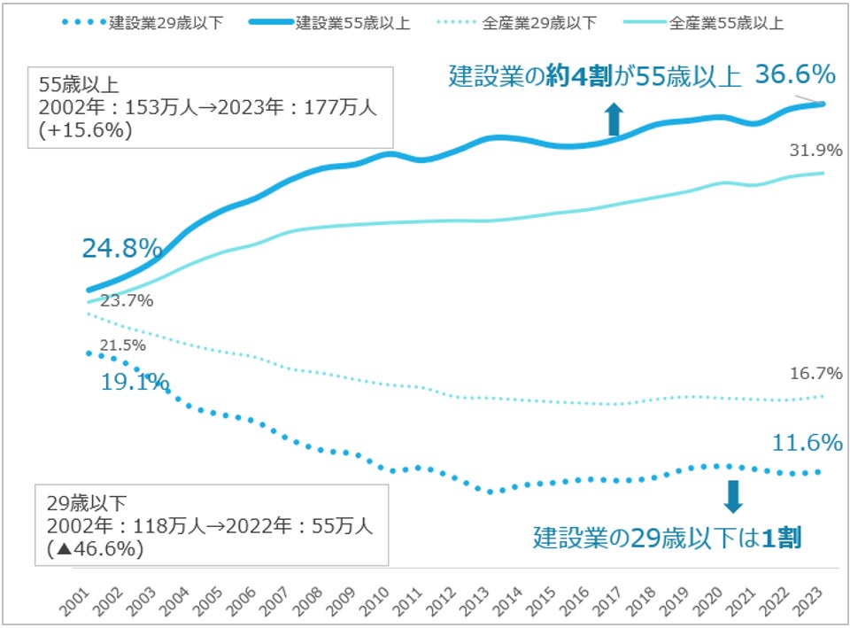 日本人の高齢化には歯止めがかかりません。特に建設業界では、55歳以上が4割、29歳以下の就労者は1割に留まります。