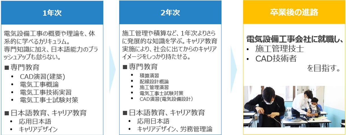 学校法人穴吹学園は、日本への留学支援や日本語教育に強みを持っています。また、国際ITエンジニア学科 電気・CADコース(2年制)では、電気設備業界で働く上で不可欠な専門知識(電気工事概論、CAD演習、施工管理演習)に加え、キャリアデザインに関する教育も実施しています。卒業時点で「第二種電気工事士」および「日本語能力検定(JLPT) N2」の取得を目指す教育により、高い専門性と日本語力を身に付けた人材を輩出しています。
