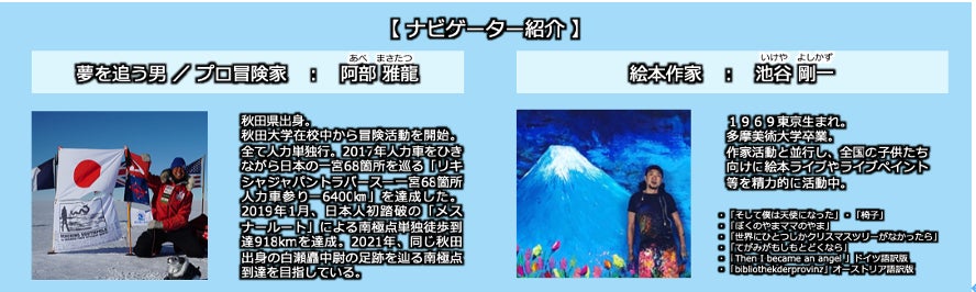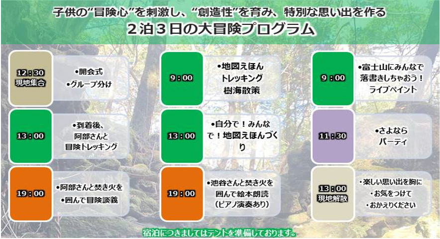 冒険学校のナビゲーターは、人類初ルートでの南極冒険を目指すプロ冒険家の阿部雅龍氏と絵本作家の池谷剛一氏がタッグを組み、自然に恵まれた日本屈指の景勝地、“霊峰富士の麓 = 西湖”を舞台に“冒険トレッキング”や“地図えほんづくりトレッキング”そして、“富士山に落書きするライブペイント”や焚き火を囲んでの体験談や絵本朗読等のプログラムを用意しました。