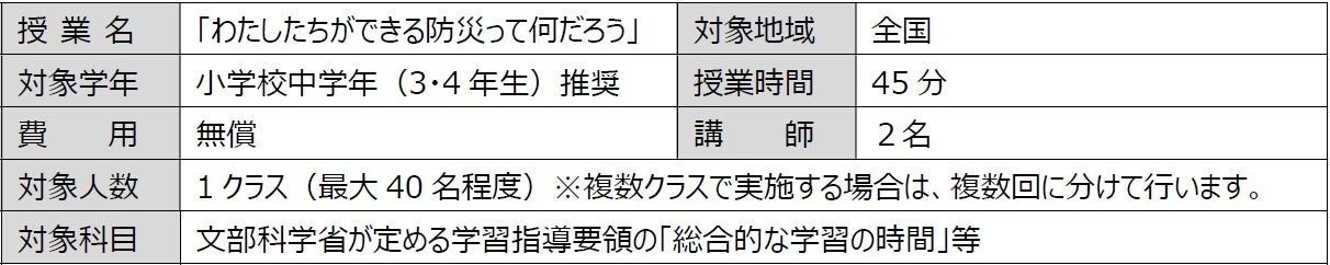 現在、子供たちを犯罪被害から守るための「防犯授業」と、心肺蘇生法の体験を通して命の尊さを学ぶ「救急救命授業」を提供し、これまでに延べ170万人を超える児童が参加しました。今回新たに開始する新授業では、激甚化する自然災害のリスクに対応した防災授業を展開することにより、地震などの「自然災害」から子供の安全を守ります。