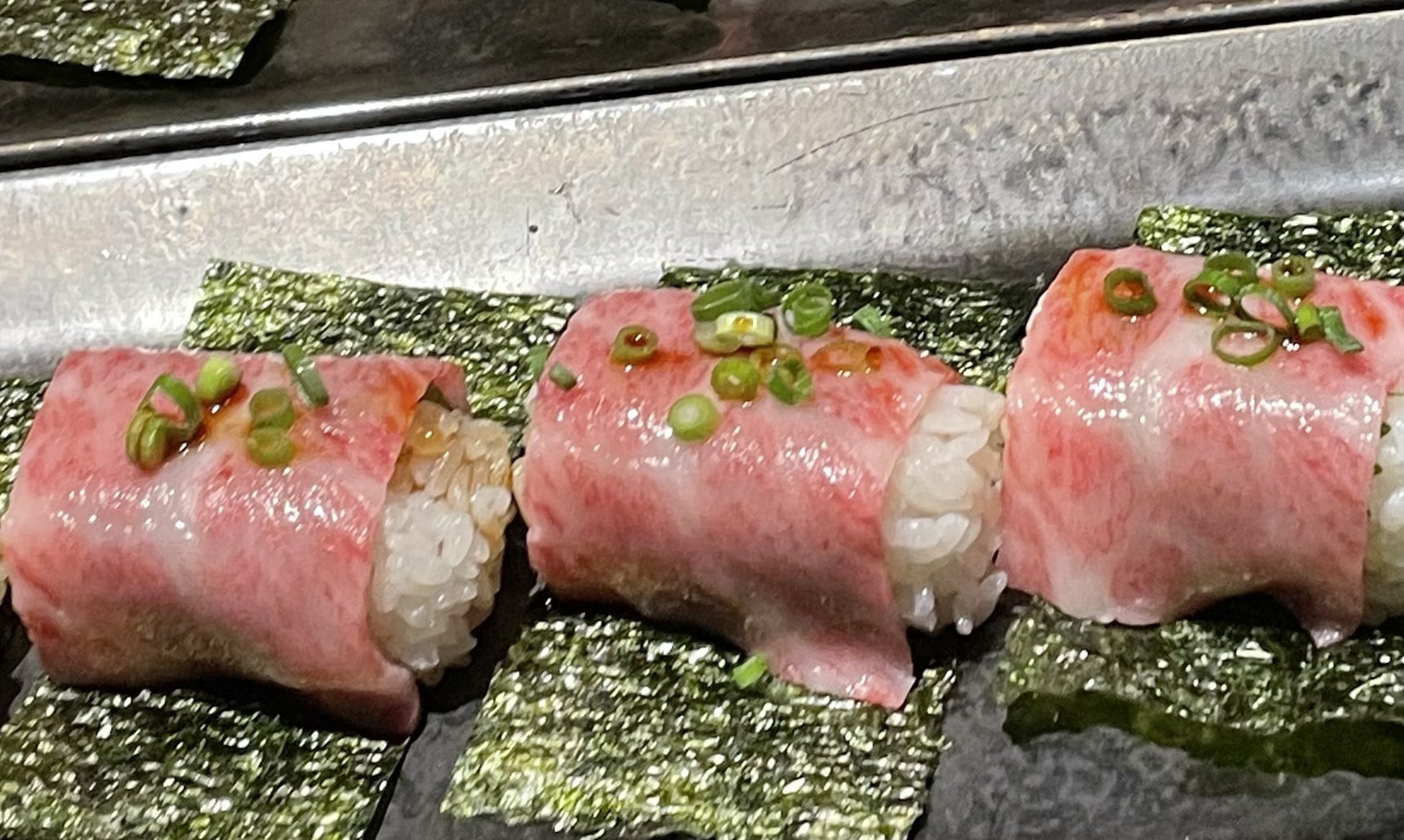 肉追い人のオーナー、今井さんが焼く「おおいた和牛」を堪能した後、2品目に「肉寿司」が出されると、