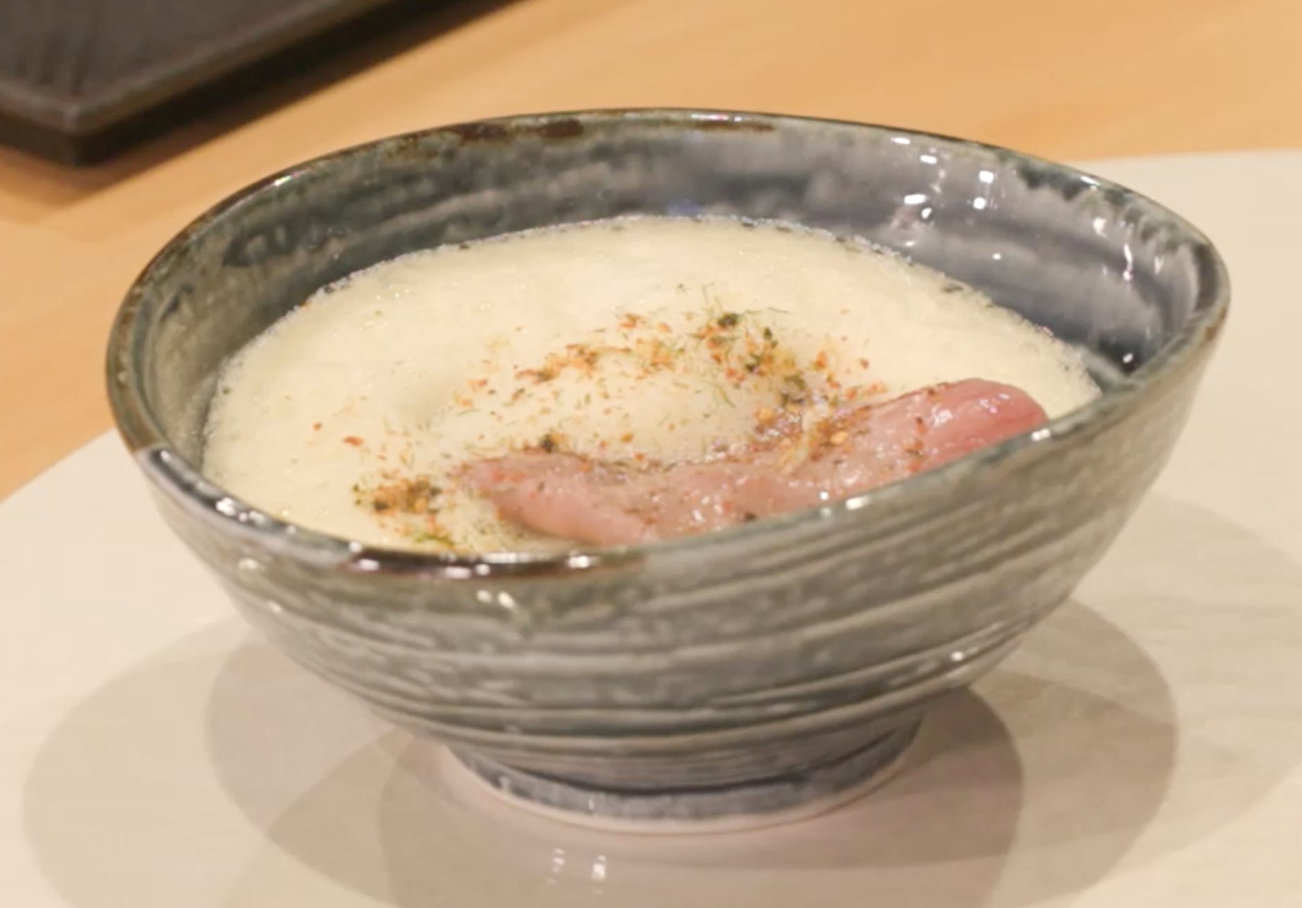 おおいた和牛を食べ尽くしてきた獅童さんも初めての「おおいた和牛サーロインの生ハム」を体験。「美味しい!溶ける〜!」と思わず笑みがこぼれます。稲垣さんが熟練の技で焼くステーキ(サーロイン・シャトーブリアン)の、噛んだ瞬間にひろがる甘さを味わい、別府の醤油との相性も抜群だったようで、ついにここでも「参りました!」