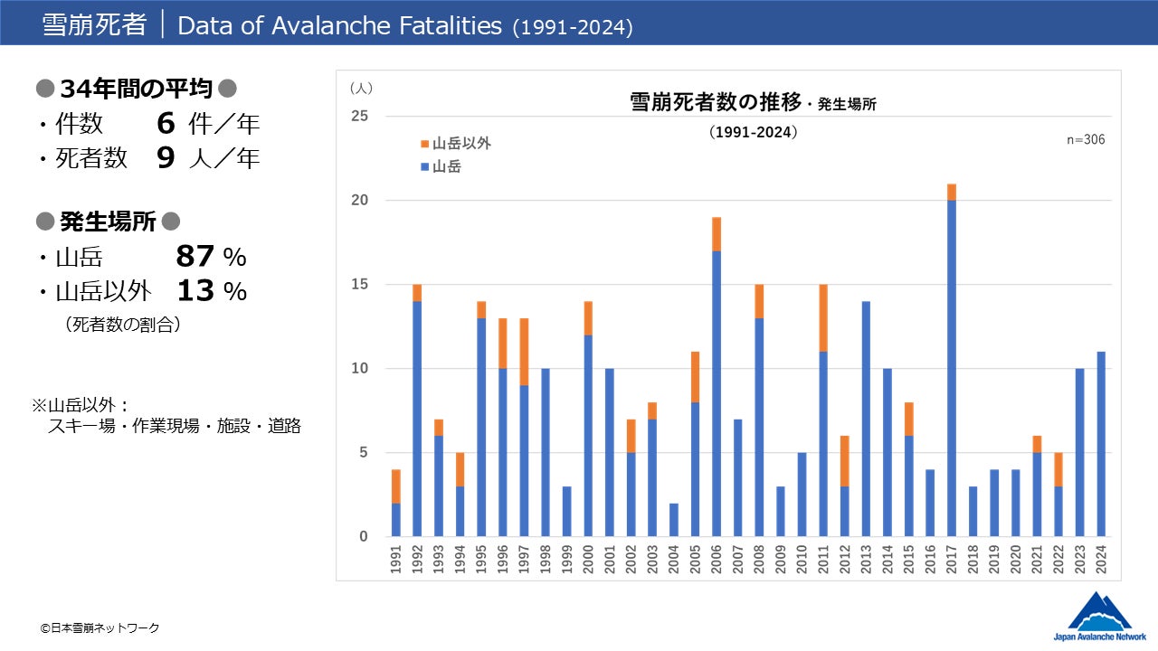 また、国が進めるインバウンド政策の影響を受け、外国籍の死者が近年は継続的に発生しています(図2)。JAPOWを求める訪日バックカントリー滑走者は2015年頃から急増しており、このシーズンに既に特徴的な死亡事故が発生しています。