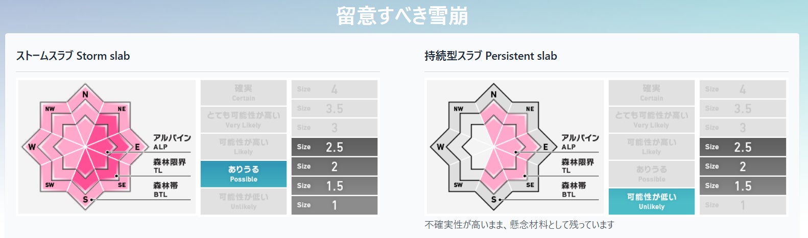 どのような種類の雪崩が、どのような場所に存在し、その誘発の可能性はどの程度なのか、そして、もし発生した場合、どのぐらいの規模になりうるか(図3)を雪山に入る方々に伝え、行動計画の修正や適切な斜面選択が可能となるように、その意思決定をサポートすることが目的です。