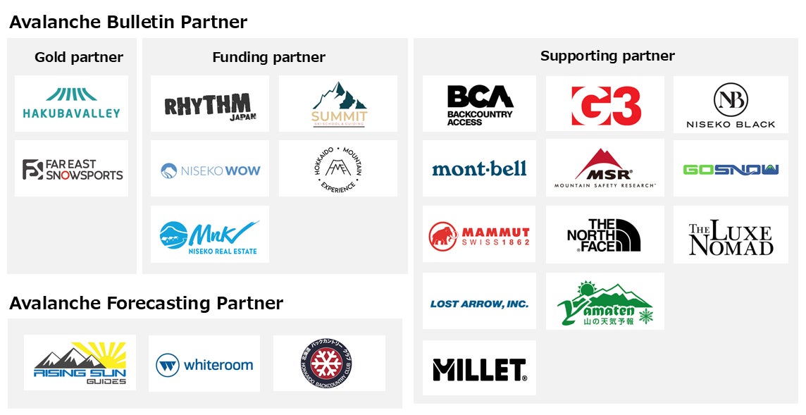 バックカントリーを楽しまれる方々に関わる企業や組織の皆さまから、雪崩情報の果たす役割の重要性をご理解いただくことで、雪崩情報の拡充や継続性などを目的として、パートナーシップを設けさせていただきました。雪崩情報の発表には、スキルと経験ある人間がフィールドで積雪コンディションの調査や情報の作成に関わる必要があり、そのための資源が必要となります。
