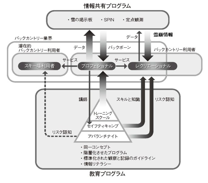 行政サービスの欠損を補完するため、弊組織では25年前の設立の時点で、教育によって人材を育成し、その人的ネットワークによって山岳の積雪コンディション情報を共有し、公衆の安全へ寄与する雪崩情報の展開を目標として活動してきました(図5)。