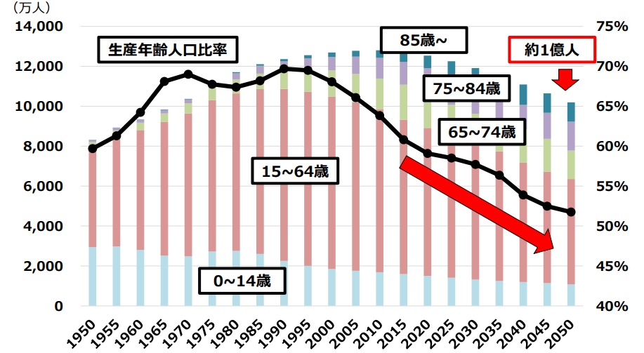 現在の日本の人口は約1億2,600万人ですが、これが2030年には1億2,000万人を割り込み、2050年には約1億人にまで減少するというデータが出ております。さらに生産年齢人口比率も下がっていくことが見込まれています。このような状況において、一人ひとりの人財が能力を発揮できず埋もれてしまうことは、日本全体の損失に繋がります。そのため、これからは今まで以上に一人ひとりの労働者のポテンシャルを引き出すことで、日本全体としての成長を図っていかなければなりません。