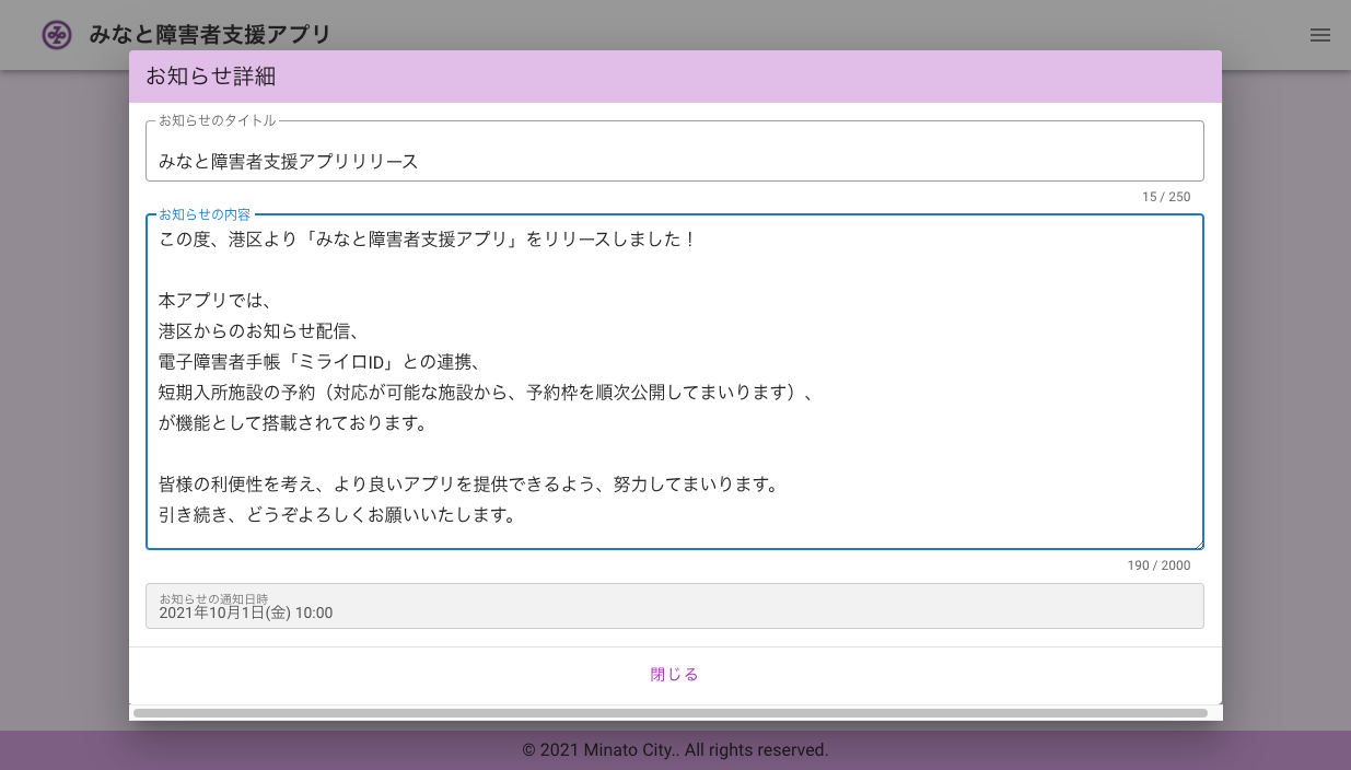 本アプリは全国初の導入先として、2021年10月1日より東京都港区において「みなと障害者支援アプリ」として運用を開始しました。