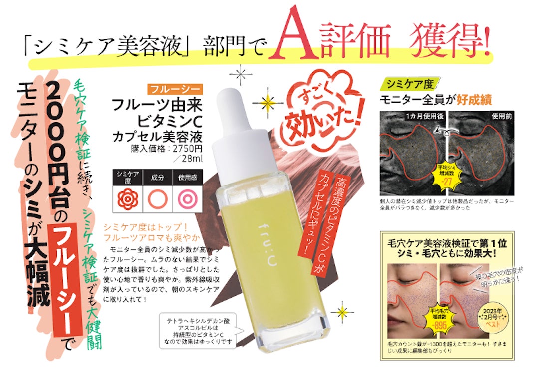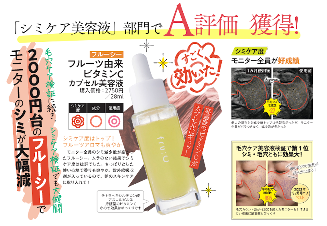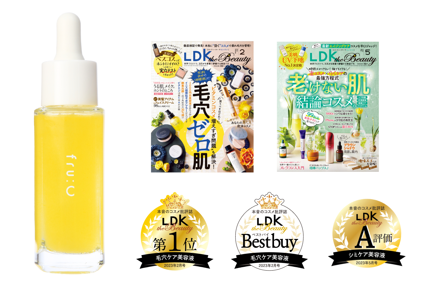 株式会社エクラ(本社:東京都新宿 代表取締役:本多智史)が展開する「fru:C美容液」。本音で評価する雑誌『LDK the Beauty』の2023年5月号にてシミケア美容液「A評価」に輝きました。