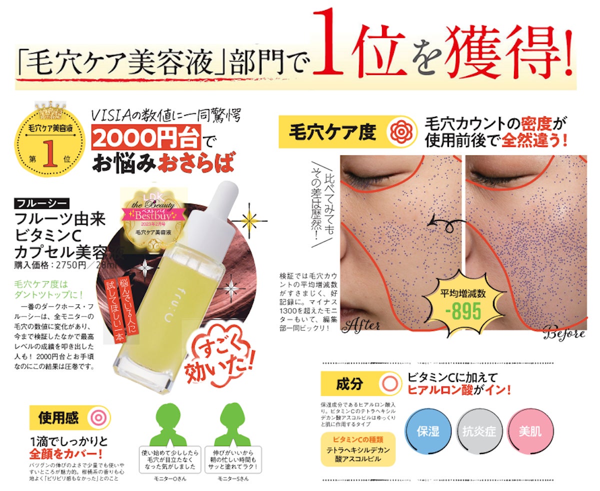 【2023年最新】辛口コスメ評価誌『LDK the Beauty』で3冠獲得!毛穴ケア部門第1位・シミケア部門で高評価のfru:C美容液とは・・・?