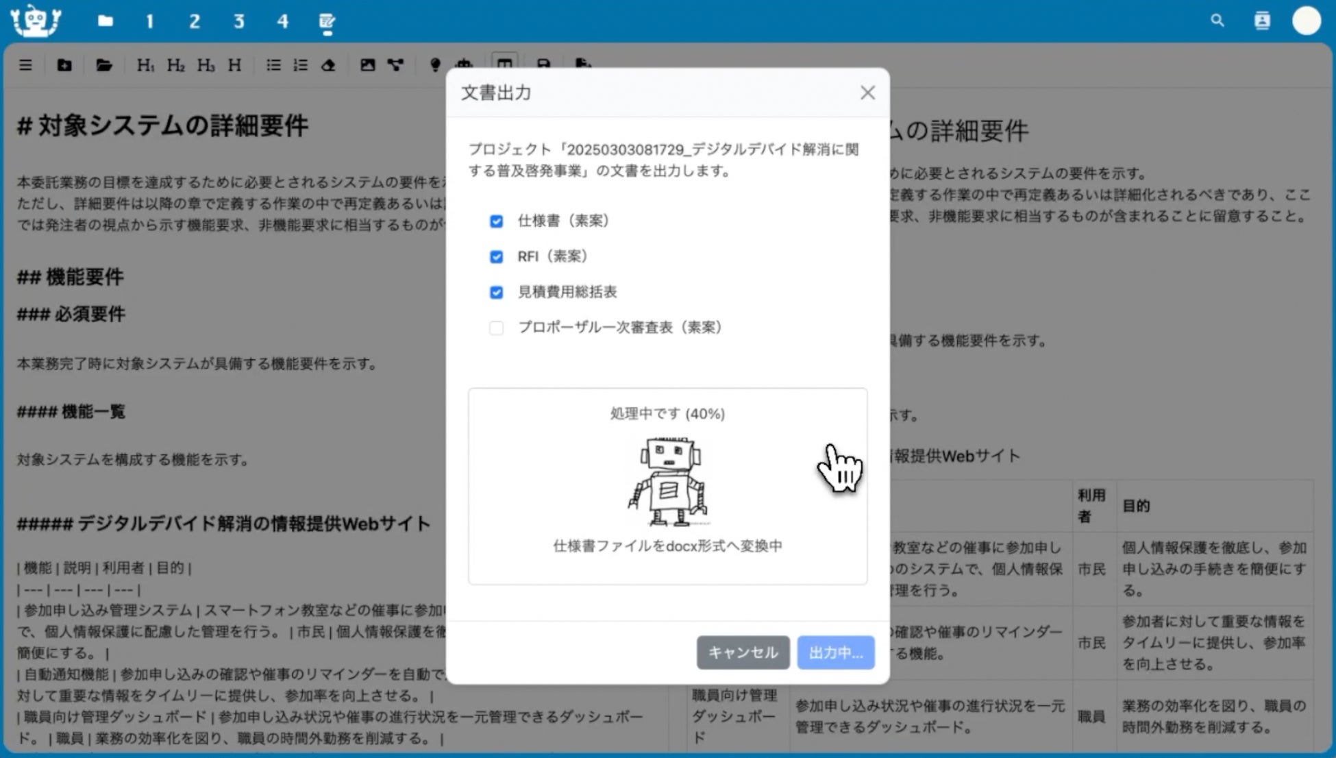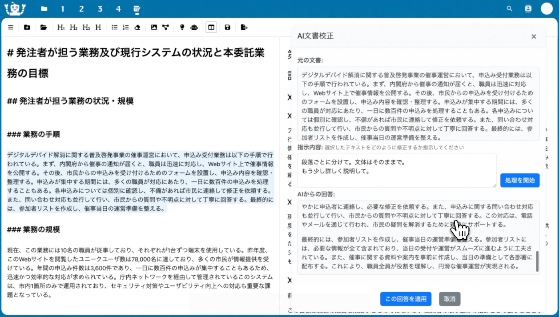 「こういう事業を実施したい」「こういう課題を解決したい」といった簡単な記述から、文意をAIが解析し、正式な仕様書形式に変換します。