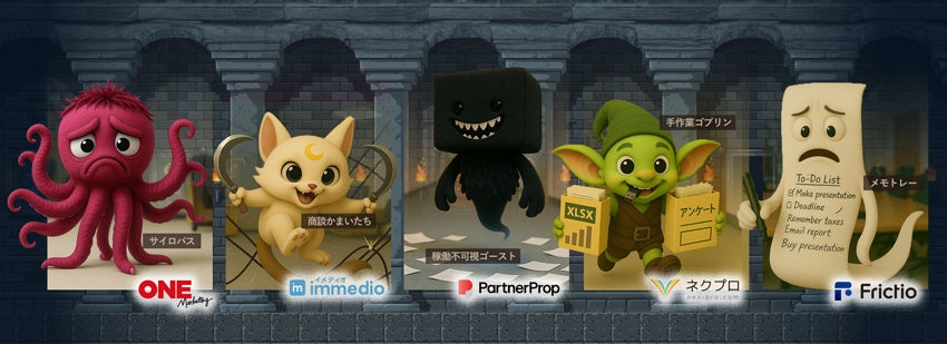 当ブースでは、ワンマーケティングをはじめ、immedio、パートナープロップ、ネクプロ、SYSLEAの5社が共演。各社が得意とする課題解決を“モンスター討伐”として表現し、実際のソリューションを提示します。