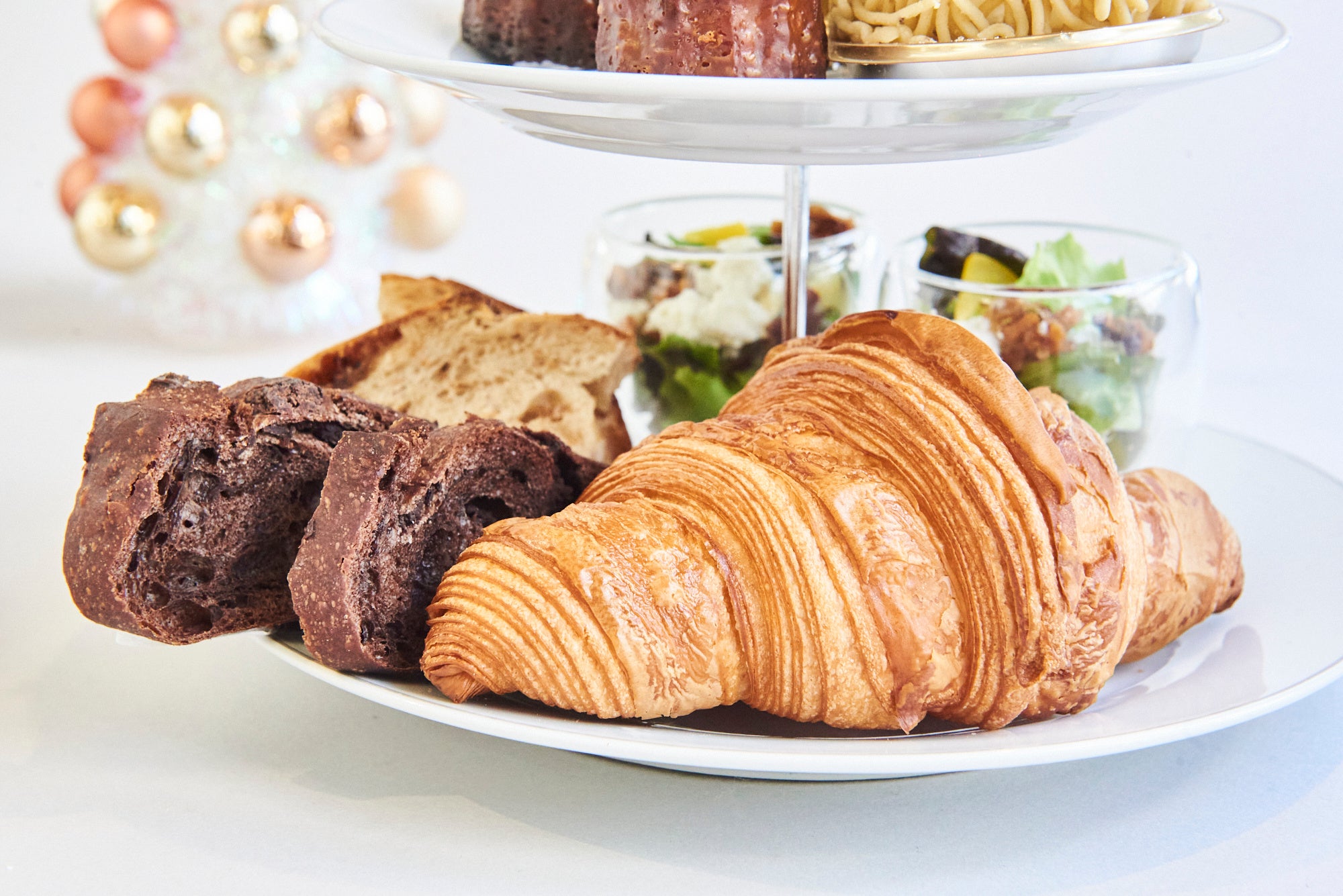 ケーキスタンドの2段目には、当店スペシャリテのAOP発酵バターを使ったクロワッサン フランセ、定番人気のデザートハードパン『パン オ カカオ』と『ミエル フィグ』、フェタチーズを使った『ギリシャ風サラダ』をご用意しました。