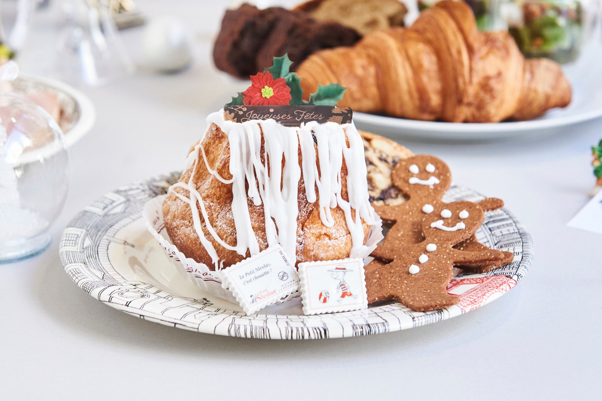 ⽯川芳美⾃ら仕⼊れたフランスGien (ジアン)のお皿の1枚目には、ノエル限定商品を盛り付けました。注目はオリジナルレシピの『ノエルクグロフ』です。カリフォルニアレーズン、サルタナレーズン、カレンツ、オレンジピール、レモンピールをラム酒に漬けてヴァニラペーストと共に練り込んで焼き上げた香り高く上品な味わいが特徴です。ノエルクグロフの美しい飾りは、フランス直輸入で全て食べられるもので出来ており、環境に配慮したいという当社の理念を形にしたものです。他にも、4種のドライフルーツをふんだんに使ってアーモンドマジパンを巻き込んで焼き上げたフランス伝統パンのシュトーレン、1枚ずつ丁寧に仕上げた可愛らしい表情のサパンドノエルクッキーと出会うことが出来ます。