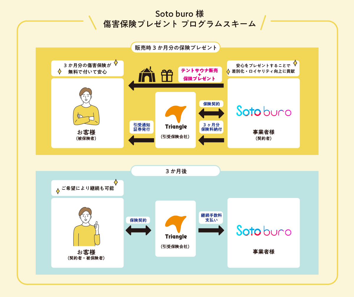 最も高級なテントサウナEX-PROシリーズを販売、レンタル、イベントを行っており、アウトドアでのテントサウナシーンにて、お客様に安心して最高のロケーションでのテントサウナ体験をして欲しいということからトライアングル少額短期保険株式会社と共同でアウトドアサウナ保険プレゼントプログラムを開発しました。