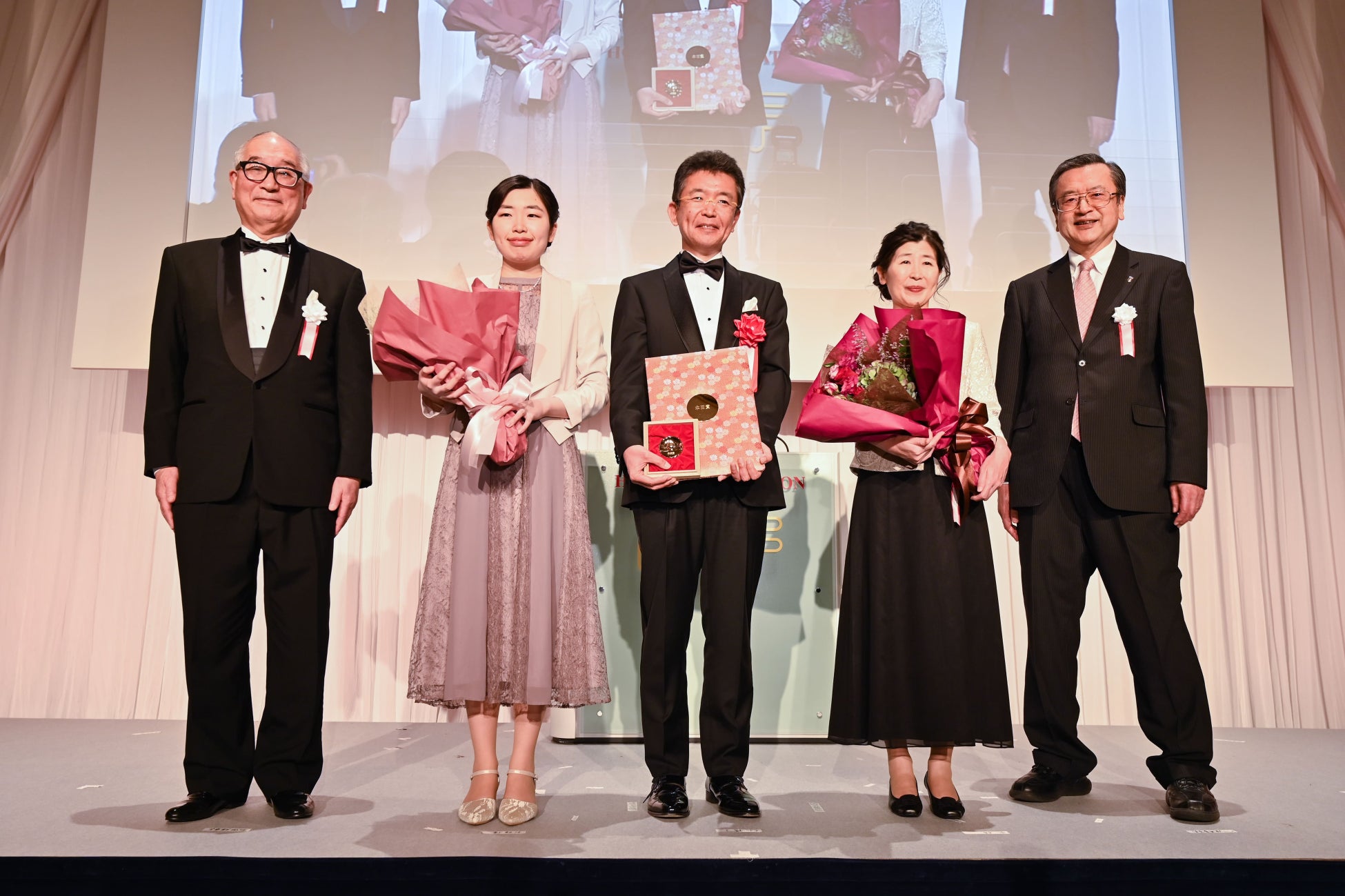 その後、香取博士への授与式が執り行われ、石田理事長より賞状、内田選考委員長からメダルの授与がございました。その後、奥様とお嬢様もステージに上がり主催者よりブーケを受け取りました。