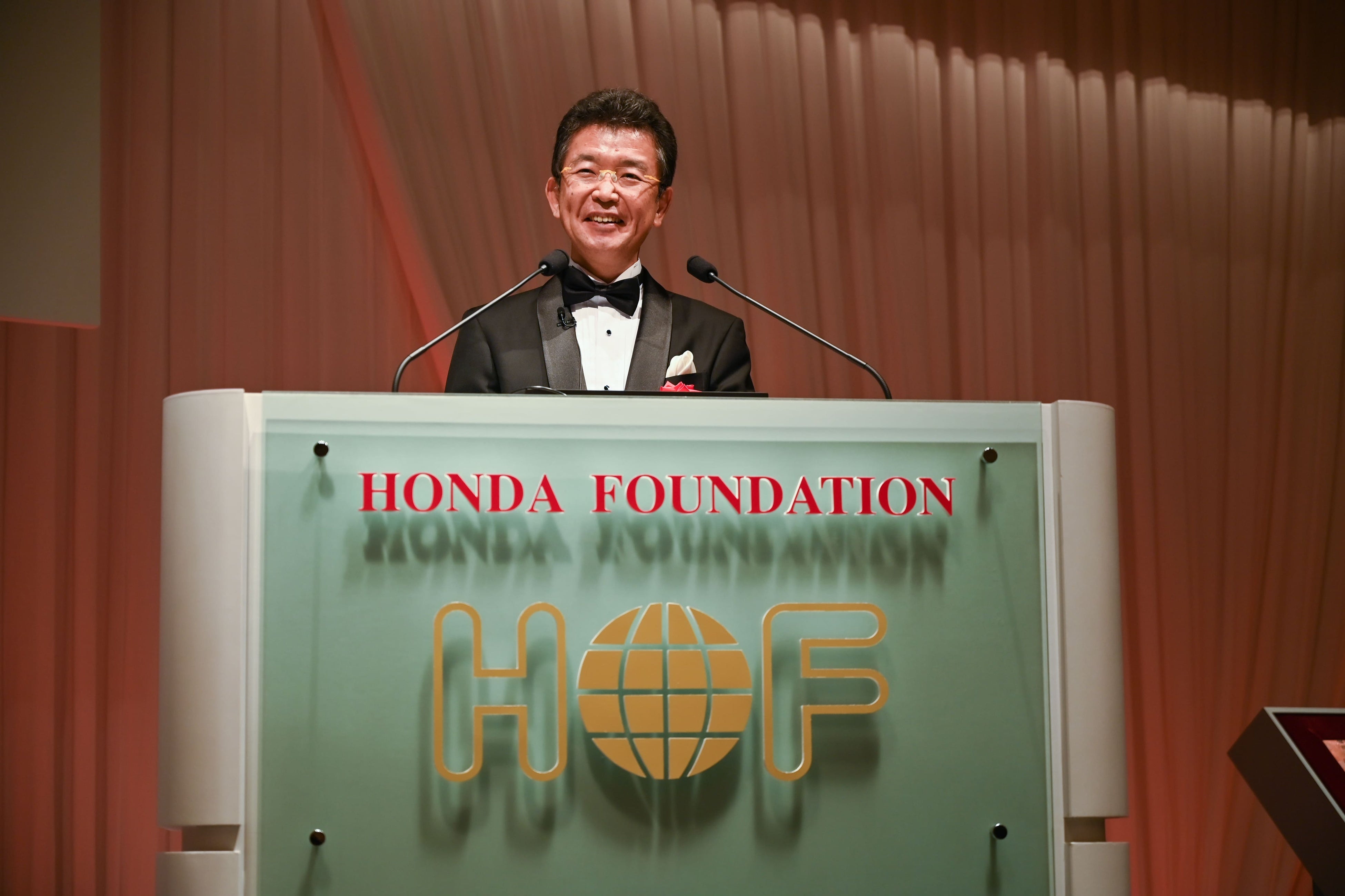 「香取博士、本田賞の受賞誠におめでとうございます。本田宗一郎さんと弟の弁二郎さんが45年前に創設した本田財団は、設立から一貫して自然や人間環境と調和する科学技術として「エコテクノロジー」という概念を提唱し、その普及と発展を世界に強く訴えて参りました。本田賞は1980年に我が国で初めて科学技術分野における国際褒章として設立されたものでございます。以降、毎年一件「エコテクノロジー」の理念を実践し、世の中に貢献された科学技術者を顕彰させていただいております。第43回目の授与者として香取博士をお迎えできたことは心から歓迎申し上げます。