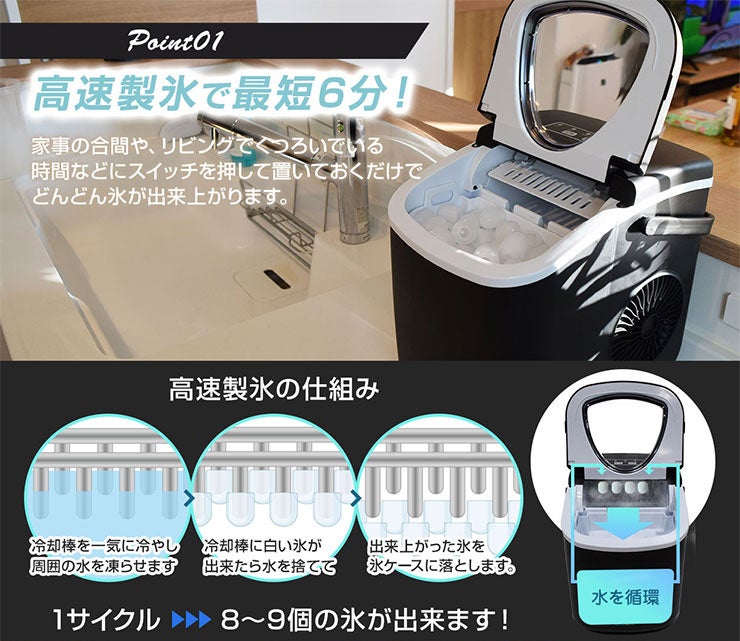急速冷却で水を一気に冷やし氷を作成します。1サイクルあたり8~9個の氷を作ることが出来ます。