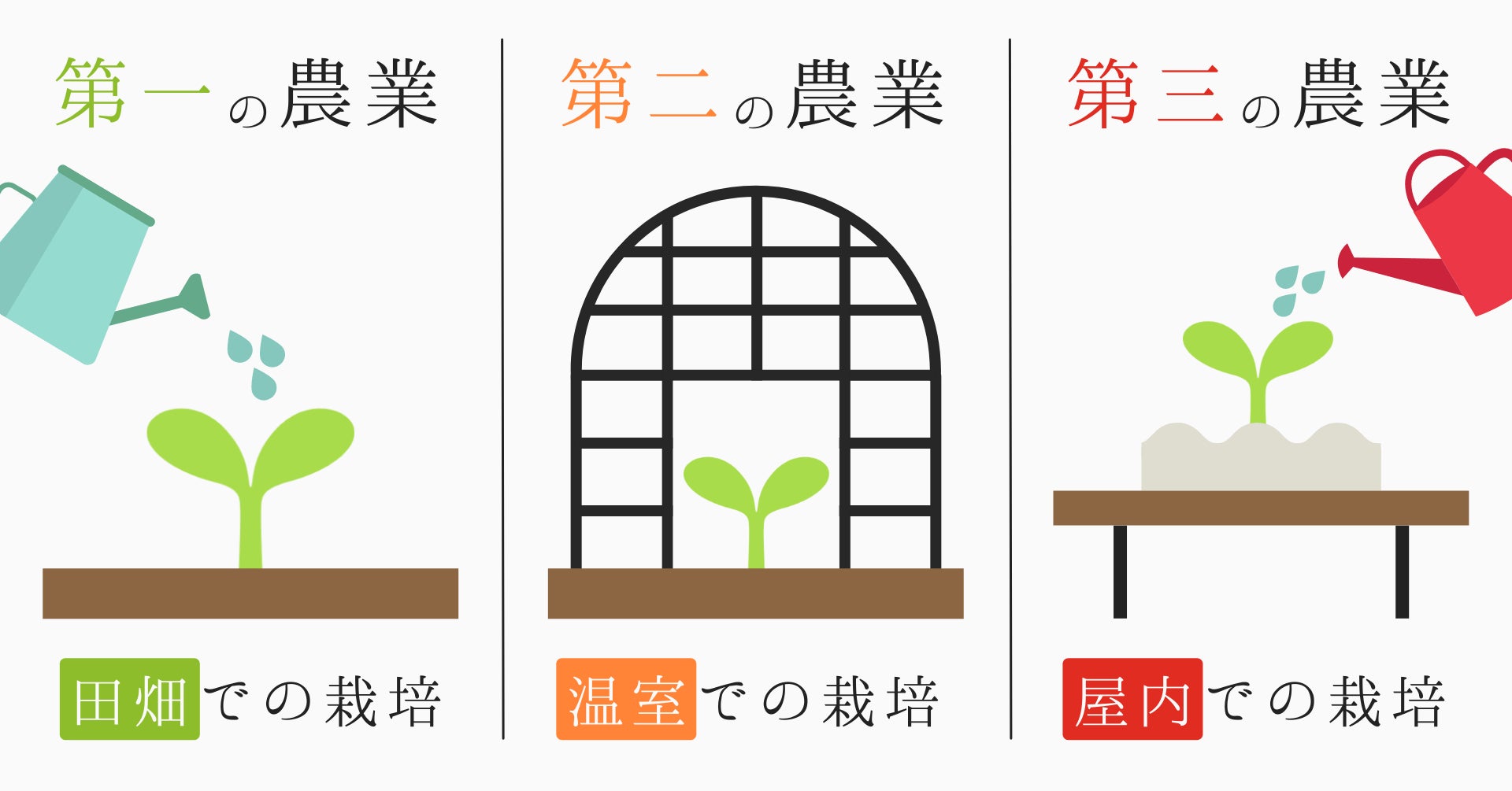 農業は、自然の中に畑を作ることから始まり(第一の農業)、太陽光や熱を効果的に利用する温室栽培(第二の農業)によって、トマトなどが季節にかかわらず、年中食べられるようになりました。